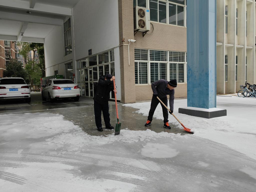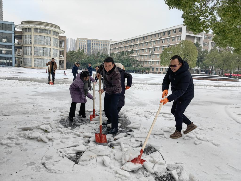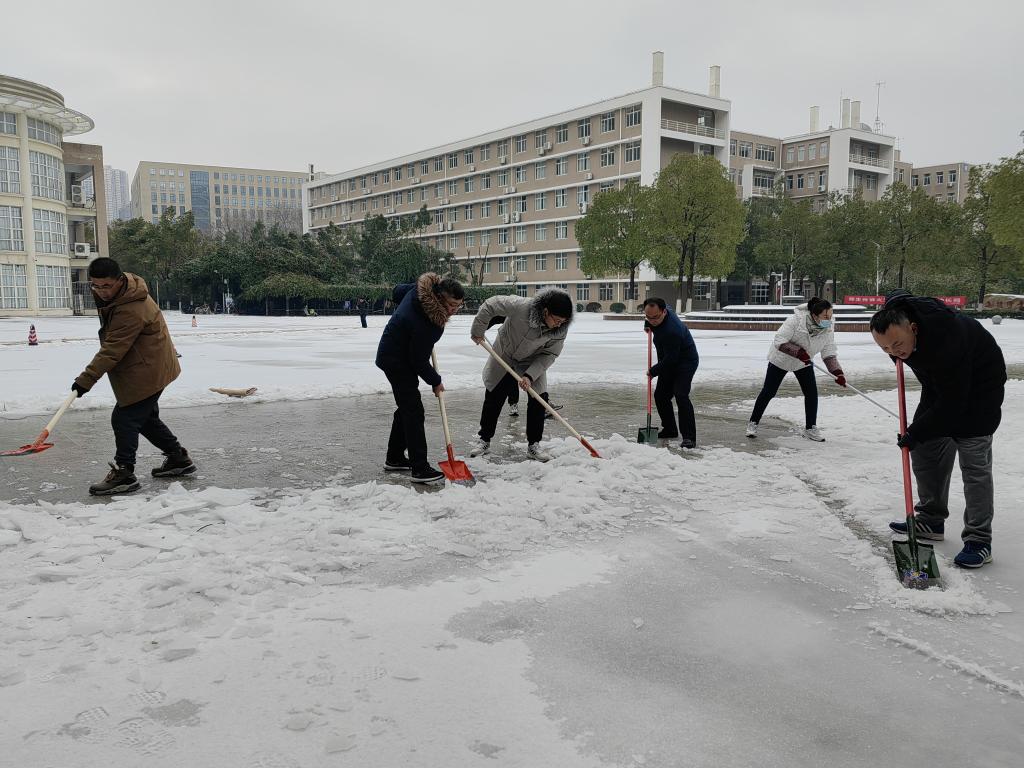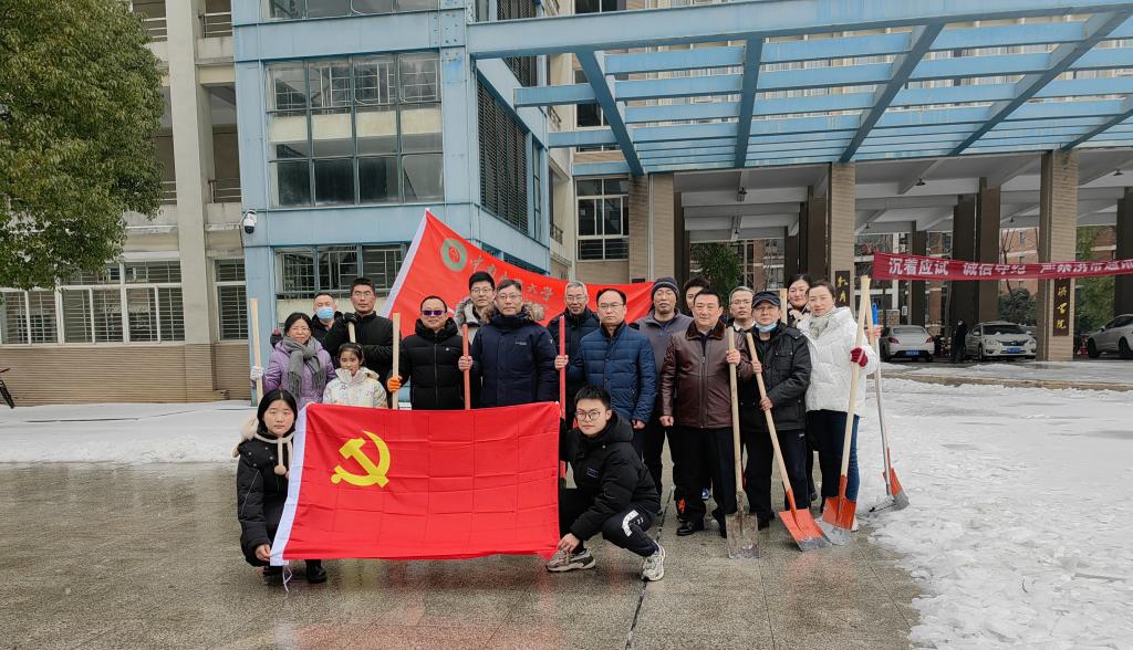因受寒潮天气影响,武汉出现了低温雨雪冰冻天气,校园道路被冰雪覆盖,师生出行困难。为保障师生出行安全,2月24日上午,学院党委组织行政干部党员和部分在校内居住的师生在15号教学楼下扫雪除冰,为师生出行清扫出多条通道。