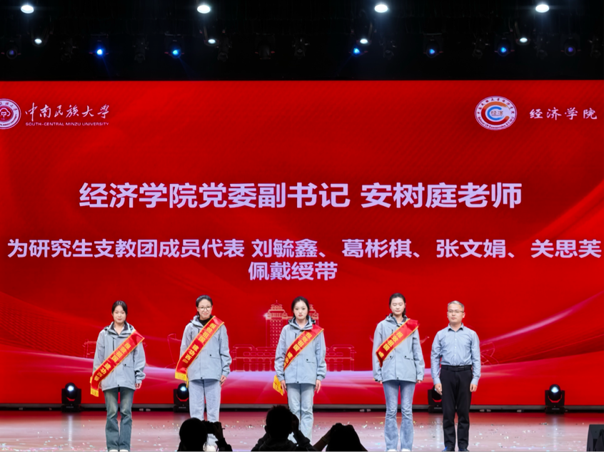 经济学院党委副书记安树庭为在校研究生支教团成员佩戴绶带,勉励青年学子以青春践行使命、以行动诠释担当。