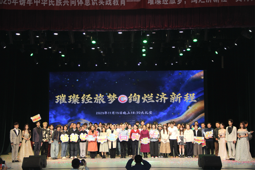 为深入推进铸牢中华民族共同体意识实践教育,深化思政教育与艺术实践的深度融合,培养德智体美劳全面发展的社会主义建设者和接班人,11月15日晚,经济学院在学校大礼堂隆重举办2025年铸牢中华民族共同体意识实践教育——“璀璨经旅梦 绚烂济新程”美育大课堂。经济学院在校领导、辅导员、班导师代表、各年级学子齐聚一堂,共同见证这场以美育人、以文化人、以情聚心的精神盛会。