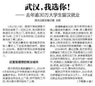 本站讯(记者:周赞)2020年下半年,随着武汉疫后重建日渐加速,各行各业的人才需求持续增长,近三十万武汉大学毕业生选择留汉就业,吸引了社会各界的广泛关注。近日,经济学院优秀本科毕业生图尔荪阿依留汉就业的事迹被湖北日报报道。2020年8月,通过学校和有关方面的推荐,通过严格招聘程序,图尔荪阿依成功就职于国信证券湖北分公司。