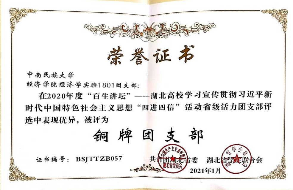 本站讯(记者:黄轩轩 唐慧扬)在共青团湖北省委、湖北省学生联合会开展的“百生讲坛”——学习宣传习近平新时代中国特色社会主义思想“四进四信”活动中,我院经济学实验1801团支部奋勇争先,取得优异成绩,获评省级“铜牌团支部”,是威尼斯官网唯一一个获得省级荣誉的团支部。