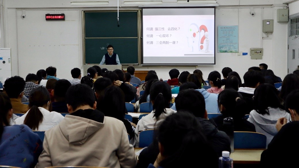 马克思主义学院团委书记金瑶以《自信自强,有为有位——新时代团学干部的自我修炼之路》为题,详细介绍了“强三性”、“去四化”、“一心双环”、“三会两制一课”的重要内涵,多方面解读了团学工作改革的政策方案。他谈到,新时代团学干部的自我修炼之路是一条艰辛、困难的路,全体学员要增强“团学是身份,干部是责任”的意识,做到志气、骨气、底气的相统一,培养吃苦吃亏、有为有位、向上向善、同向同行的优秀精神品质,力求在服务奉献中磨砺自己,在善作善为中充实自己,在好学上进中提升自己,在追梦圆梦中成就自己。