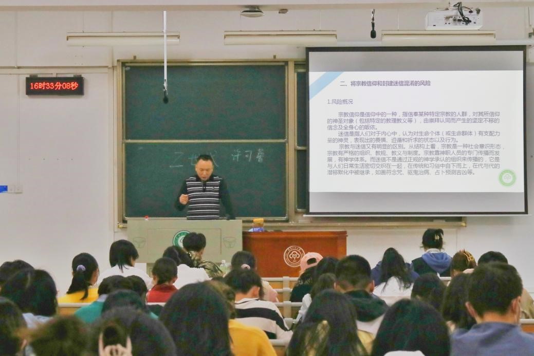 经济学院2019级辅导员熊岳炜对大学生活中的五大风险——思想风险、学业风险、工作风险、生活风险及情感风险做出深入阐述,并结合实例一一进行分析,要求学员们积极参加思想政治教育和党史学习教育,反对资产阶级自由化思潮;正确区分宗教信仰与封建迷信,学习科学文化知识的同时,尊重他人的民族习俗;保持勤俭节约的生活习惯与优良的精神品质,防范享乐、奢靡的思想风险;在“内卷”的大环境中保持理性,拒绝“躺平”,不懈奋斗;警惕不法分子煽动民族矛盾,区分个人矛盾和民族矛盾,为民族团结与交流作出贡献;积极参与社会实践活动,培养社会责任感,摆脱网络依赖。他希望学员们防范规避风险,培养良好的学习生活习惯,协调好学习与学生工作的关系,提高自身能力,实现自我成长。