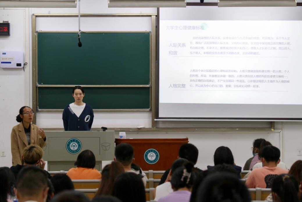 会上,两位主讲人围绕大学生常见心理问题及知识、心理委员工作职责和角色定位、大学生心理健康问题应对方法以及认识心理咨询四个方面展开介绍。廖梦琪表示,大学生应该高度重视和关注心理健康,心理委员和寝室长应积极主动关心身边同学的心理动态,及时向辅导员和班导师反馈情况,并通过协助开展心理健康培训和定期组织主题班会等方式帮助同学们深入学习相关知识,正确认识自身心理健康状态。张竹云结合实际案例,详细阐述了大学生常见心理问题的症状表现、预防措施及应对方法,分享了学校心理咨询预约流程,鼓励同学们通过科学有效的方式摆脱不良情绪,保持健康乐观、积极向上的心态。