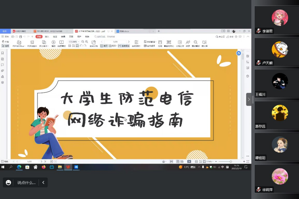 本次班团会重点引导同学们做好“三防三重视”:春季传染病防治、防范新冠病毒感染、电信诈骗防范;重视国家安全、校纪校规和生活规范、心理健康。同时,启发同学们实现“两个目标”,即养成良好学习生活习惯和提高自我保护能力,以积极向上的精神状态迎接新学期的学习与生活。
