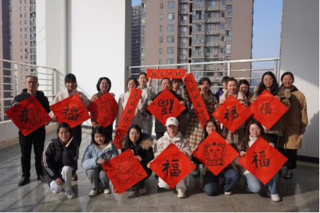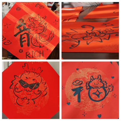 活动现场,师生们热情洋溢,通过巧构妙思,挥毫泼墨,写下一幅幅意喻吉祥、承载美好祝福的春联。“玉兔披金辞旧岁,祥龙焕彩贺新春”“兔乘神舟登月去,龙腾盛世领春来”“春色明媚山河披锦绣,华夏腾飞祖国万年青”“共铸民族团结盛世,同赢甲辰繁荣年华”......不仅有楷书、行书、草书等多种春联字体表现形式,也有师生们化用卡通、动漫形象创作出别具一格、青春活泼的“福”字,还有不少同寝室友共绘的新春创意年画。
