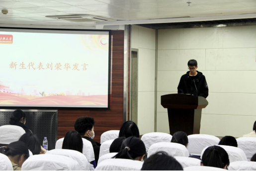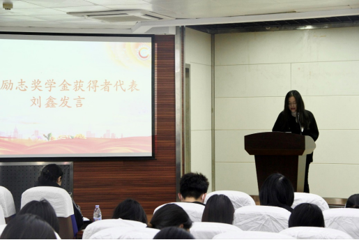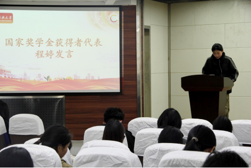 图为新生代表刘荣华、国奖代表程婷、国励代表刘鑫依次发言