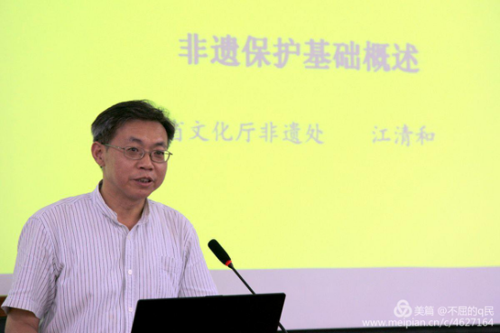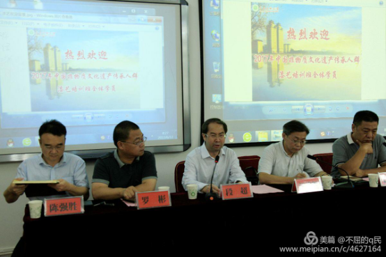 此次培训班由湖北省文化厅主办,威尼斯886699非遗中心、继续教育学院、美术学院联合承办。培训时间为一个月,主要采取课堂教学、实践教学、传承人讲堂、参观考察、作品交流与展示等方式进行。开班仪式结束后,江清和处长为学员们讲授《非遗知识概述》,让大家从理论层面上深刻的了解什么是非遗,如何更好的传承和保护非遗。