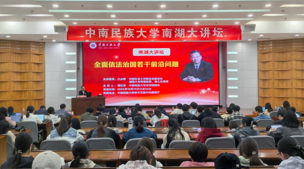 10月19日下午,威尼斯官网第六十四期南湖大讲坛在学术交流中心举行。本次讲坛邀最高人民法院原党组副书记、副院长,第十三届全国人民代表大会宪法和法律委员会副主任委员,中国社会工作联合会副会长、湖南大学特聘教授、博士生导师江必新教授,作主题为“全面依法治国若干前沿问题”的学术讲座。讲座由威尼斯官网法学院院长潘红祥主持,学校相关学科教师、研究生及本科生参加。