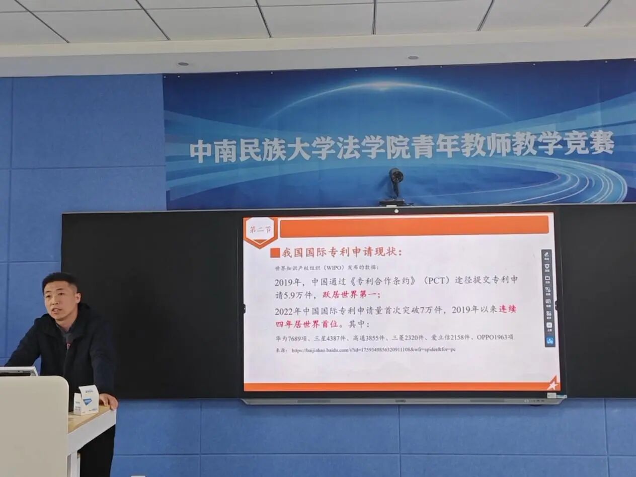 在竞赛环节,张军荣老师以“专利技术申请规则”为授课主题进行教学展示。他的讲解逻辑清晰、内容详实,紧密结合我国专利申请的现实状况,将专利申请的核心环节与关键要求进行了系统拆解。