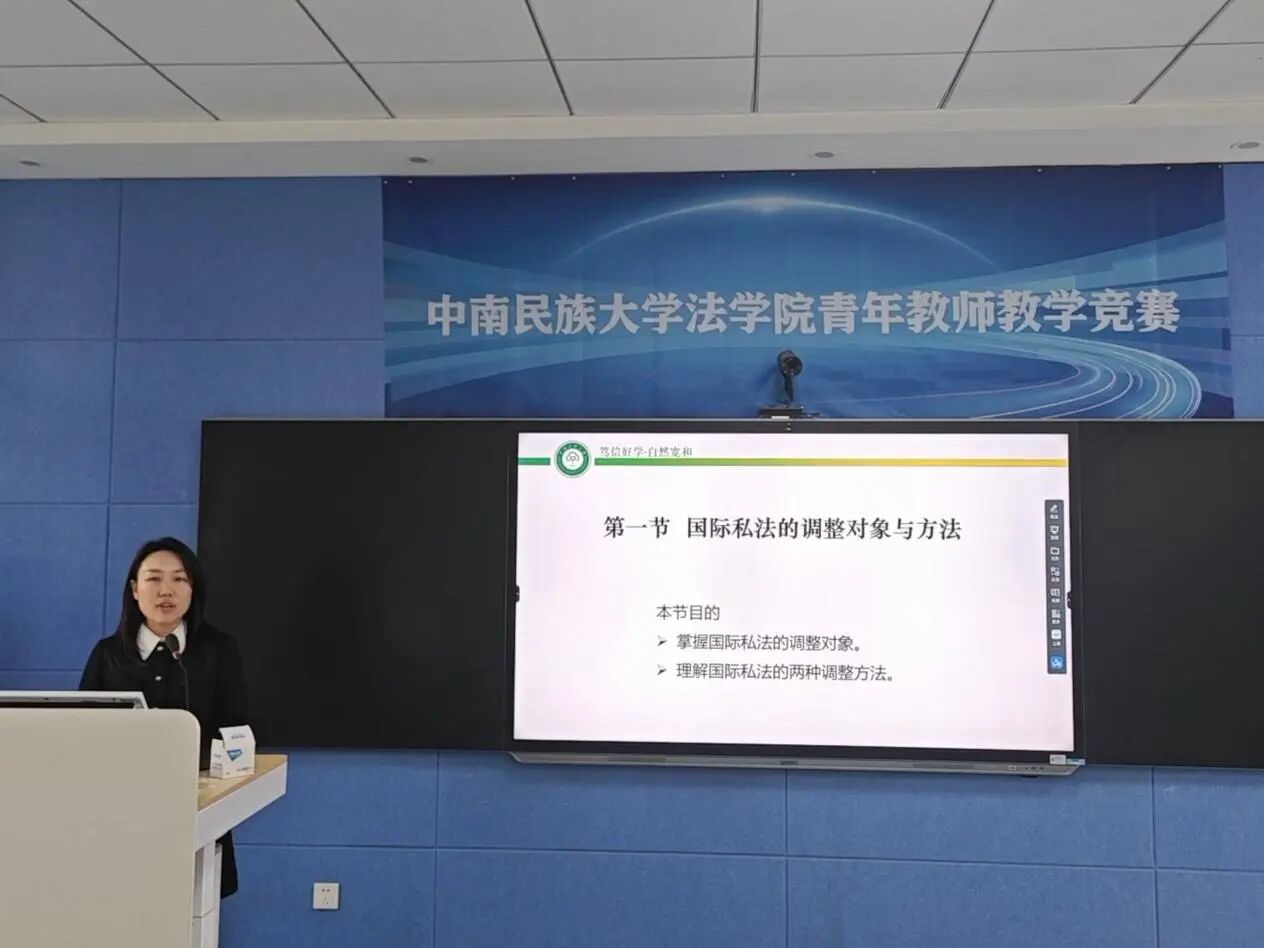 陈杰老师教学展示的主题是“国际私法的调整对象和方法”。她首先以“跨国婚姻”这一贴近生活的案例引入主题,自然过渡到涉外法律关系的解读。授课过程中,她精准引用相关法条,结合域外司法实践展开比较分析,展现了国际私法调整涉外民事关系的独特逻辑与方法。