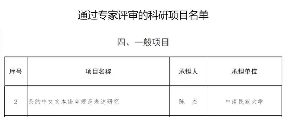 11月17日,国家语委科研规划领导小组办公室公示了2022年度通过专家评审的科研项目名单。我院陈杰老师主持的项目《条约中文文本语言规范表述研究》获得一般项目立项。