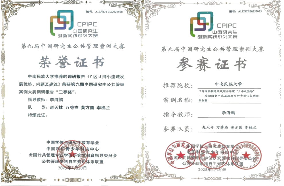近日,从第九届中国研究生公共管理案例大赛组委会传来捷报,我院MPA中心组织推荐的调研报告《Y区J河小流域发展优势、问题及建议》在全国众多顶尖高校的激烈角逐中脱颖而出,荣获大赛调研报告“三等奖”。这意味着,继2024年2月获得三项省级三等奖、2025年3月获得两项省级二等奖后,我院研究生团队在公共管理案例大赛中的表现又上新台阶。