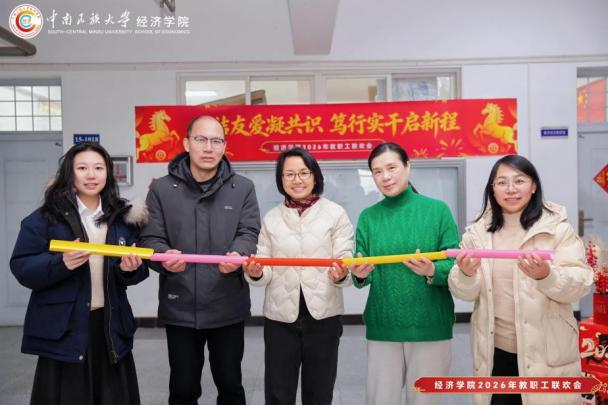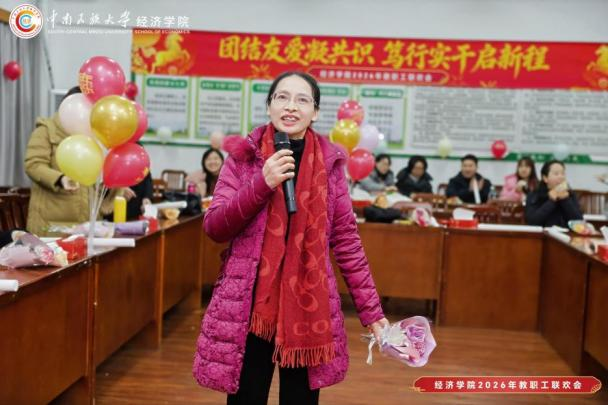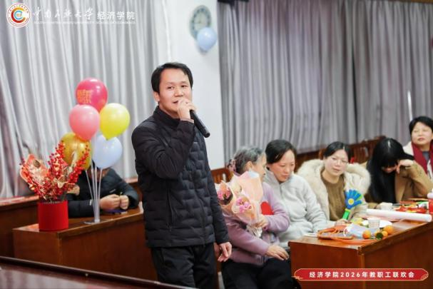岁末辞旧,迎新纳福。在2026年寒假即将开启、新春佳节渐行渐近之际,为进一步拧紧学院教职工情感纽带,筑牢团队归属感与向心力,在校工会的指导下,学院工会的精心策划下,经济学院于1月20日下午隆重举办“团结友爱凝共识 笃行实干启新程”教职工联欢会。学院全体领导、教职工,以及在经济学院担任研究生导师、班导师的院外教师代表欢聚一堂,在欢声笑语中畅叙同事情谊,共话新春期许,擘画学院发展新蓝图。