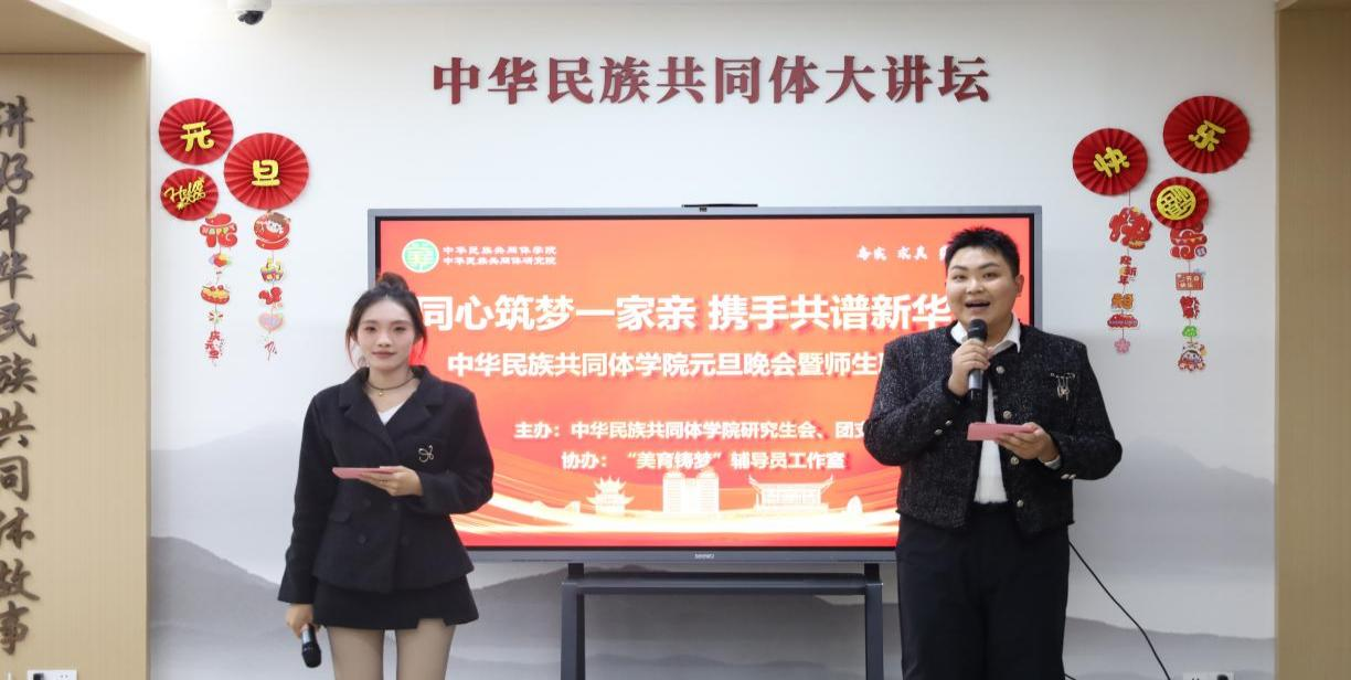 岁序更迭,华章日新。为加强师生交流、凝聚集体力量,丰富校园文化生活,12月26日晚,我院“同心筑梦一家亲,携手共谱新华章”元旦晚会暨师生联谊会在图书馆北书院圆满举行。本次由“美育铸梦”辅导员工作室协办,学院领导班子、在校教职工和硕博士学生参加。