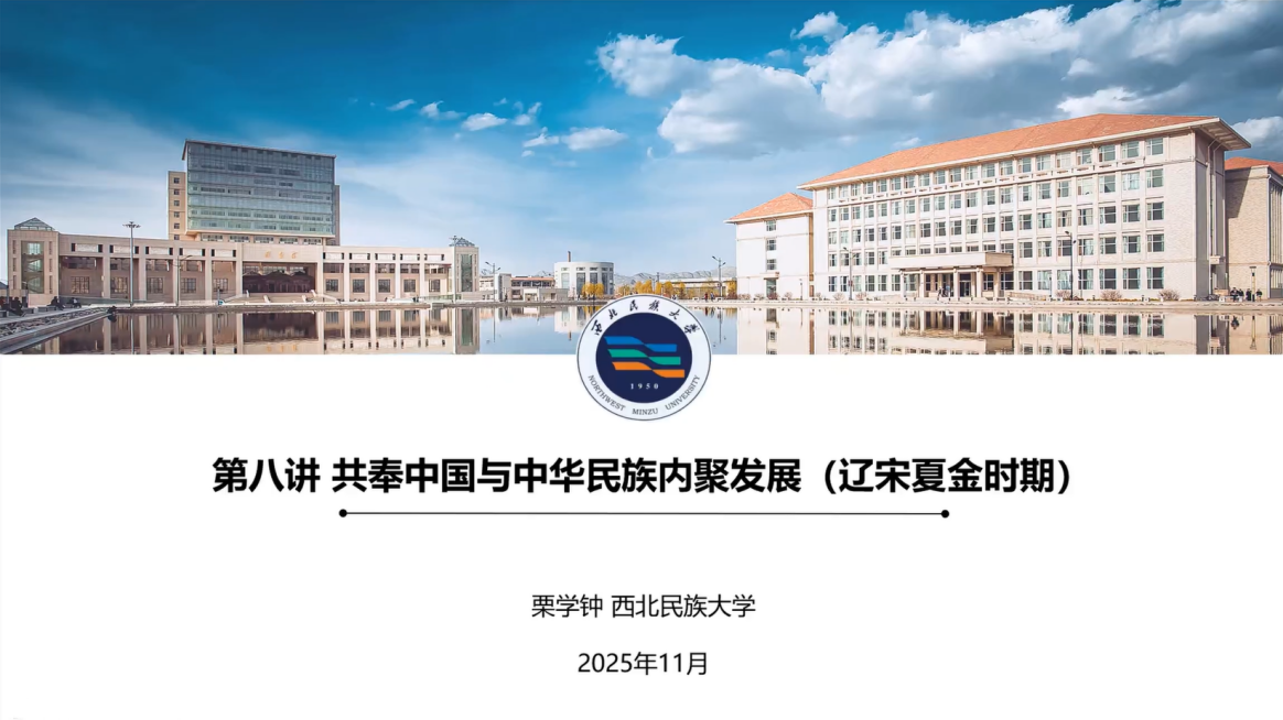 栗学钟聚焦《中华民族共同体概论》教材第八讲“共奉中国与中华民族内聚发展(辽宋夏金时期)”的内容,以“共奉中国”为核心,通过“桃花石”“宋钱币”“辽上京”“孔圣人”四个典型案例,围绕辽宋夏金时期各民族政权在政治、经济、社会、文化的多维互动与交融展开讲解。他指出各政权虽并立却共认“中国”正统,宋钱通行四方彰显经济互补交融,辽上京“择中而立”体现中华筑城理念传承,各族“尊孔崇儒”增强了文化认同。他强调授课需以史料为基,从讲故事上升到讲道理,强化学生对中华民族共同性的认同,使概论课成为系统传授中华民族共同体理论的“核心课程”,铸牢中华民族共同体意识的“思想高地”以及推进中华民族共同体建设的“实践平台”。