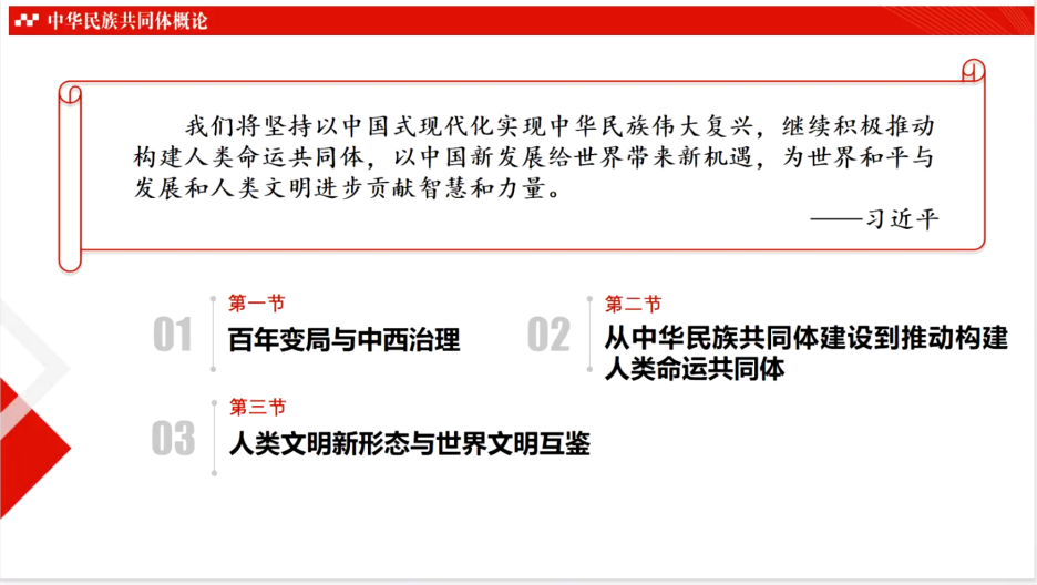 刘晓雯主讲《中华民族共同体概论》第十六讲“文明新路与人类命运共同体”。她以世界格局的变迁为切入点,突出现代西方国家认同的困境,比较中西“合”与“分”、“和平发展”与“巧取豪夺”的治理逻辑,从而引出推动构建人类命运共同体的全球治理新范式。她重点讲述“天下观”是中国提出推动构建人类命运共同体的思想基础,通过“黄帝时代的核心主体”“大秦时代的智术借鉴”“建国时代的价值引领”三个关键节点,使“天下一家”的理念一脉相承。同时,她认为,人类文明新形态开辟文明发展新路径、新境界,中国道路打破了“历史终结论”和“国强必霸论”,中华文明与西方文明之间绝非“文明冲突”关系,二者之间要深化交流互鉴,并且要与广大第三世界国家的文明携手同行,共建更加公正合理的国际政治经济新秩序。