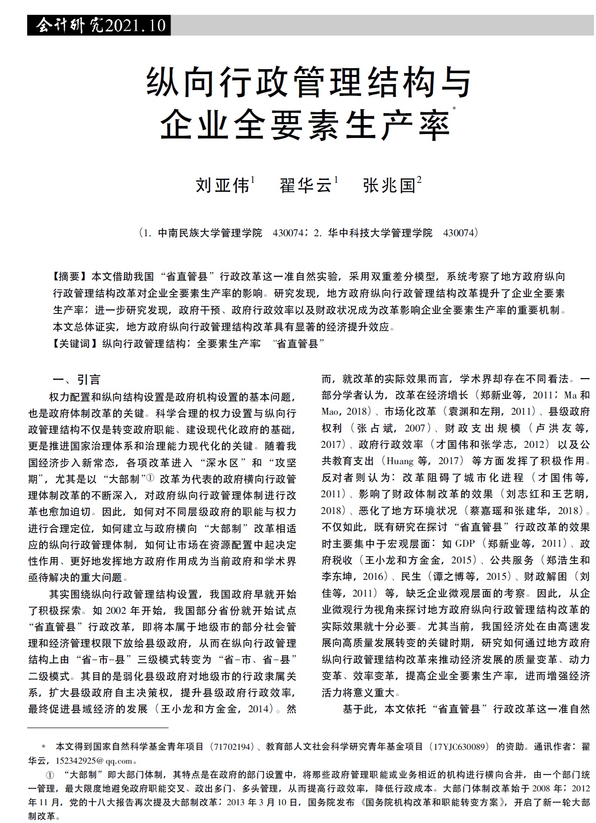 由我基地教师刘亚伟副教授、翟华云教授以及华中科技大学张兆国教授合作的论文《纵向行政管理结构与企业全要素生产率》在会计学权威期刊《会计研究》2021年第10期成功发表。
