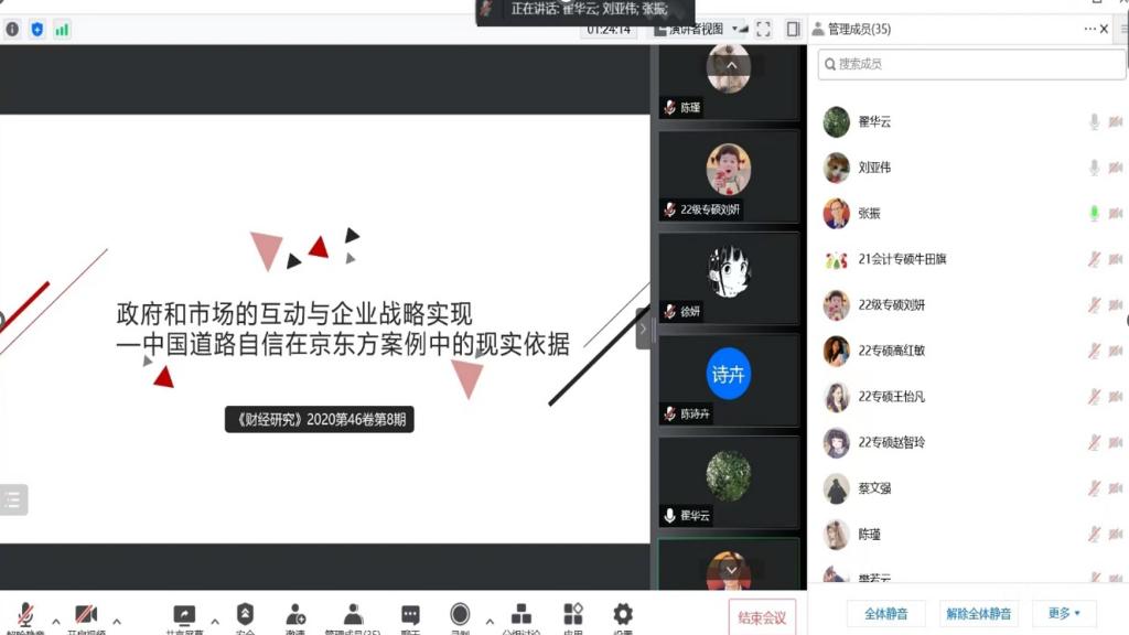 2020级专硕卓宣成同学分享的文章是《政府和市场的互动与企业战略实现——中国道路自信在京东方案例中的现实依据》(作者:步丹璐等)。首先,卓宣成同学从政府和市场二分对立切入,简要描述了对政府和市场关系的认识。文章选择了具有代表性的京东方公司案例。卓宣成同学介绍到:政府支持和和市场机制是相辅相成的,既需要充分发挥政府的引导作用,也需要发挥多层次市场在资源配置中的决定性作用,中央政府依据信息总量优势制定总体战略。根据生命周期理论,政府和市场互动的战略效果呈现出一定的周期性和滞后性。然后文章通过一系列的案例数据分层次地证明了提出的三个命题。