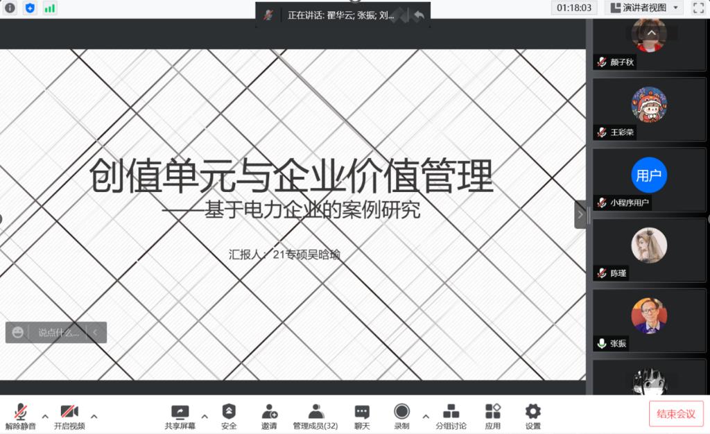 2021级专硕吴晗瑜同学分享的文章是《创值单元与企业价值管理——基于电力企业的案例研究》(作者:葛玉洁等)。该文章是借助案例企业创值单元的识别和应用,分析创值单元的作用机制,构建"价值活动—价值场景—价值决策"的价值管理模型,为实现企业整体价值最大化提供可能。吴晗瑜同学按照文献回顾与理论基础、研究设计、案例研究以及总结四大部分进行了讲解。首先,吴晗瑜同学对现有会计信息的局限以及创值单元,可供性理论进行了介绍。其次,她介绍了文章选择该案例企业的原因以及资料收集与数据编码过程。再次,吴晗瑜同学对案例企业进行介绍,并且对基于VCU的价值管理决策循环结构进行了讲解,也就是价值活动发生-VCU反映-价值场景构建-管理决策进行-价值活动(发生/调整)的过程。接着,她对文章中的VCU的识别过程与结果进行了清晰的讲解。最后,吴晗瑜同学总结了文章的结论,并提出一些关于该文章的启示。