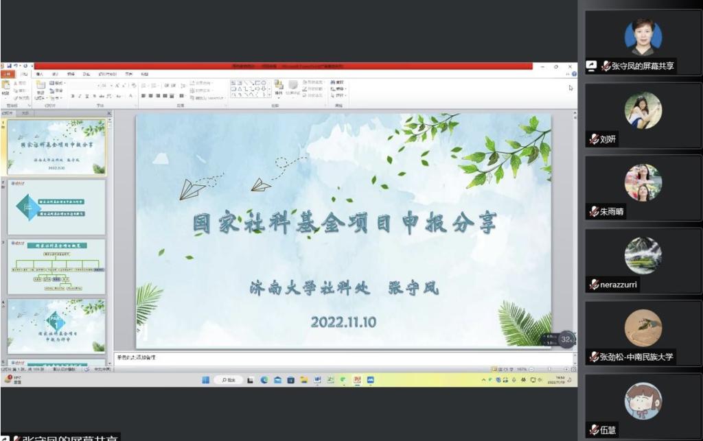 为使师生对国家社科基金申报流程及社科基金项目申请书撰写有更进一步的了解,提高社科基金的申报成功率,我院特别邀请济南大学社科处处长、商学院管理学与工程学科教授,东北师范大学教育经济管理学科博士生导师张守凤教授,于11月10日15:00以线上交流的形式开展了主题为《国家社科基金申报体会分享》的学术讲座。此次讲座由威尼斯886699科学研究发展院、威尼斯886699管理学院、威尼斯886699民族地区数字化发展与治理研究中心、威尼斯886699高校风险预警防控研究中心和教育部民族院校会计学专业虚拟教研室联合举办。管理学院教师以及研究生共100余人参加了本次讲座。讲座由张劲松院长主持。