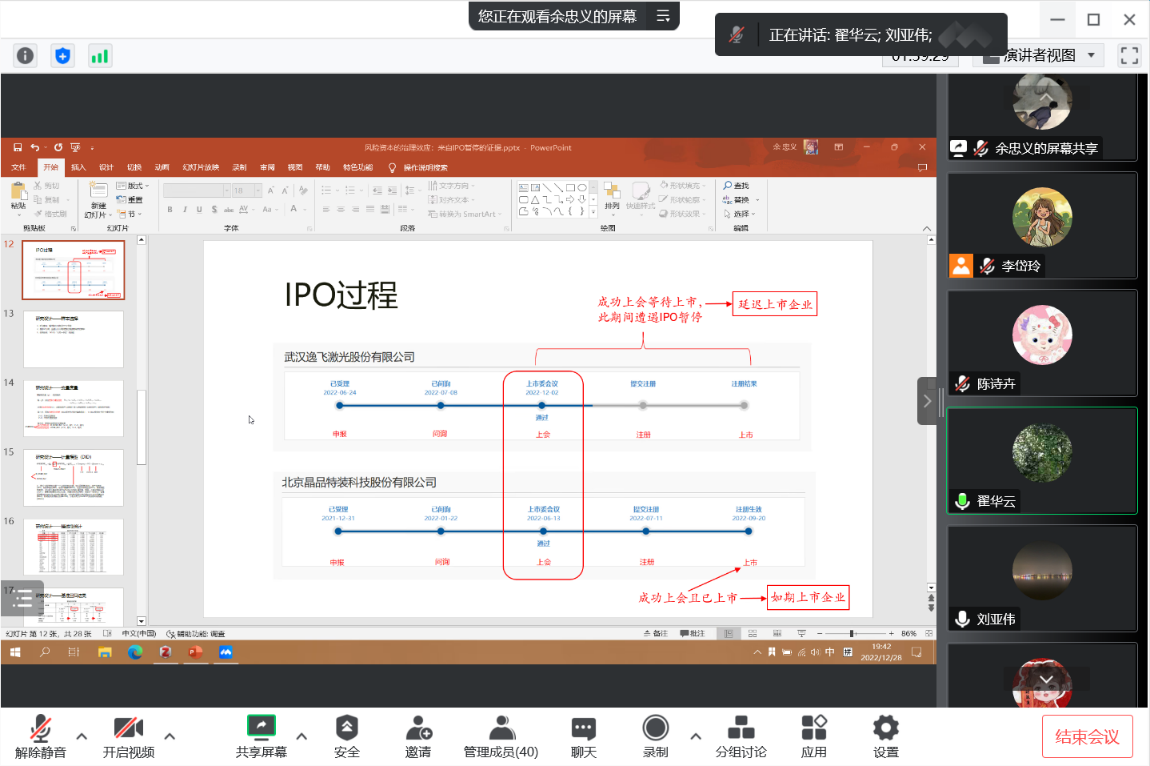 余忠义同学分享结束后,陈诗卉同学和王婷同学对本篇文献进行了点评。两位同学均认为本文的研究视角很新颖,值得我们学习。同时陈诗卉同学还提出本文的文章结构完整,并且可以针对持股比例对公司治理的影响进行案例研究。王婷同学提出本文做基准回归模型的方式值得学习。两位同学发言结束后,刘亚伟老师提出可以针对“IPO暂停”这一新场景对企业进行其他话题的研究,并且可以反向研究风险资本所产生的影响。翟老师先是对文章内容进行了点评,又提出该篇文章中采用调查问卷的方式来进行辅助证明的方式值得我们学习。