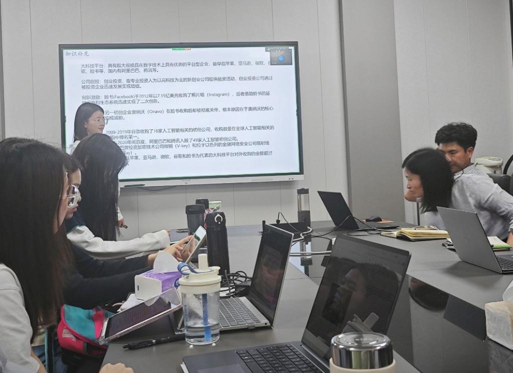 周婷婷同学分享后,周越同学和何蜜蜜同学对文章进行了评价。周越同学提出未来可以从大科技平台扩张带来的利与弊展开案例研究。何蜜蜜同学提出可以从数字创新系统对大科技平台的影响做研究。张振老师表示,本文的研究方法非常丰富,值得仔细挖掘,可以学习本文的思路来写案例。