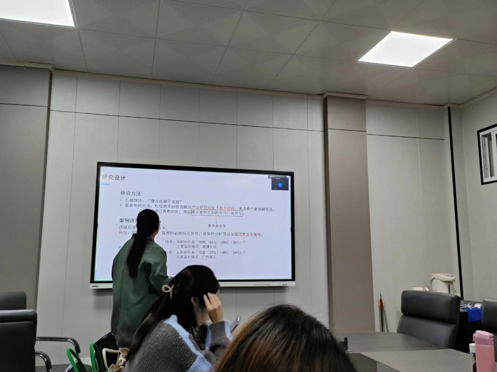 2023级专硕王思煜同学分享的文章是《短视频平台的企业社会责任及其动态履责路径——基于快手和抖音的双案例研究》(作者:王仙雅等)。王思煜同学先分别介绍了平台型企业和平台型媒体的概念及特征,接着详细介绍文章的模型阐述与研究发现部分。文章运用扎根理论对快手和抖音两个案例资料进行数据分析,提炼了三种类型的社会责任及每种社会责任对应的履责路径。研究发现短视频平台的履责路径具有顺序性和动态性。