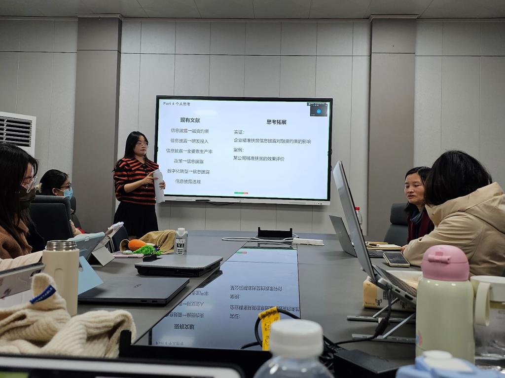 2023级学硕周羽彤同学分享的文章是《上市公司精准扶贫信息披露对基金投资的信号作用》(作者:张学勇等)。首先,周羽彤同学进行精准扶贫政策背景的介绍和已有研究回顾,概述本文研究与行文的思路。接着,对文章的研究设计和实证检验部分进行了详细讲解。文章从理论分析和实证检验两个方面出发,分析验证了上市公司披露精准扶贫信息对基金投资产生积极效果等一系列结论。