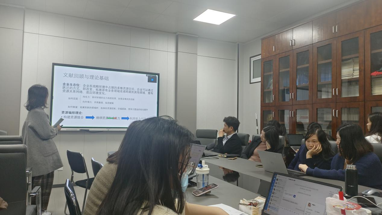 李子奕同学分享后,黄勤思同学和陈心蕊同学对文章进行了评价。黄勤思同学认为,后发企业经营初期也面临资源有限、产品价值低等问题,需要转变企业战略、发掘资源,可以试着研究后发企业实现生态位跃迁的机理。陈心蕊同学从本文延伸到资源编排理论对企业数智化转型的推动作用。刘亚伟老师指出,想要增强本文与我们的财会专业的联系,可以在企业面对压力、寻找机会和实现价值这些过程的分析中融入财务决策和治理层视角。翟华云老师称赞本文清晰的逻辑思维和机制总结,再次强调了严密合理的逻辑在研究生论文写作中的重要性。