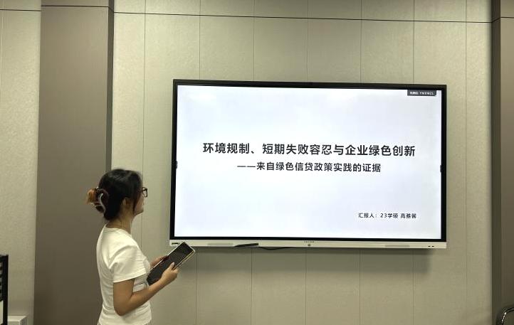 2023级学硕高雅馨同学分享的文章是《环境规制、短期失败容忍与企业绿色创新——来自绿色信贷政策实践的证据》(作者:郭俊杰等),文章选择短期失败容忍这一独特视角来探讨环境规制工具与企业绿色创新之间的关系。高雅馨同学首先概述了文章的研究背景,并明确提出核心研究问题,在详细介绍环境规制工具的分类和短期失败容忍的定义后,梳理了文章的总体逻辑链条,最后对主回归、机制检验以及异质性分析等实证研究部分进行了具体说明。根据这篇文章给予的启发,高雅馨同学提出可以研究节能减排财政政策综合示范城市与资本跨地区流动之间的关系。