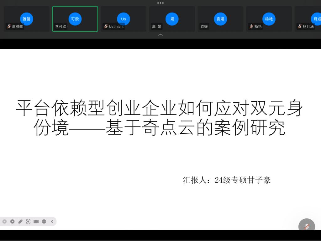2024级专硕甘子豪同学分享的文章是《平台依赖型创业企业如何应对双元身份困境——基于奇点云的案例研究》(作者:梅景瑶等)。甘子豪同学首先介绍了平台依赖型创业企业面临的双元身份困境背景,随后解释了平台依赖型创业企业(PDEs)和双元身份困境等关键词,并引出了本文的研究问题:PDEs如何通过动态身份塑造应对双元身份困境。研究发现,PDEs通过建构创业框架,在机会识别、机会开发和机会拓展等不同阶段采取不同的身份塑造策略。奇点云案例表明,PDEs需平衡平台跟随者与独立自主创业者两种身份,以获取内外部资源。最后,甘子豪同学提出,未来可进一步探讨PDEs动态身份塑造过程中的成本管理等问题,如考察基于“双元身份困境”的平台依赖型创业企业成本管理研究。