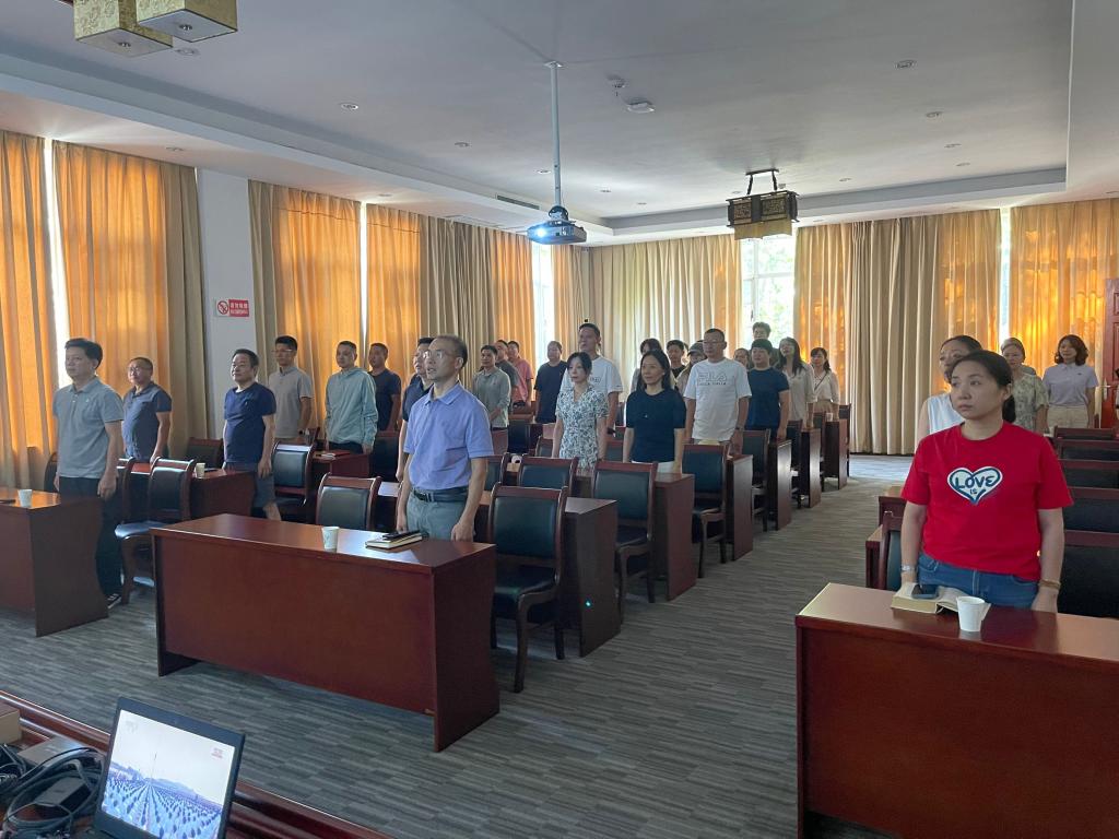 (图2:全体职工集体起立、奏唱国歌、对国旗行注目礼,高唱国歌。)