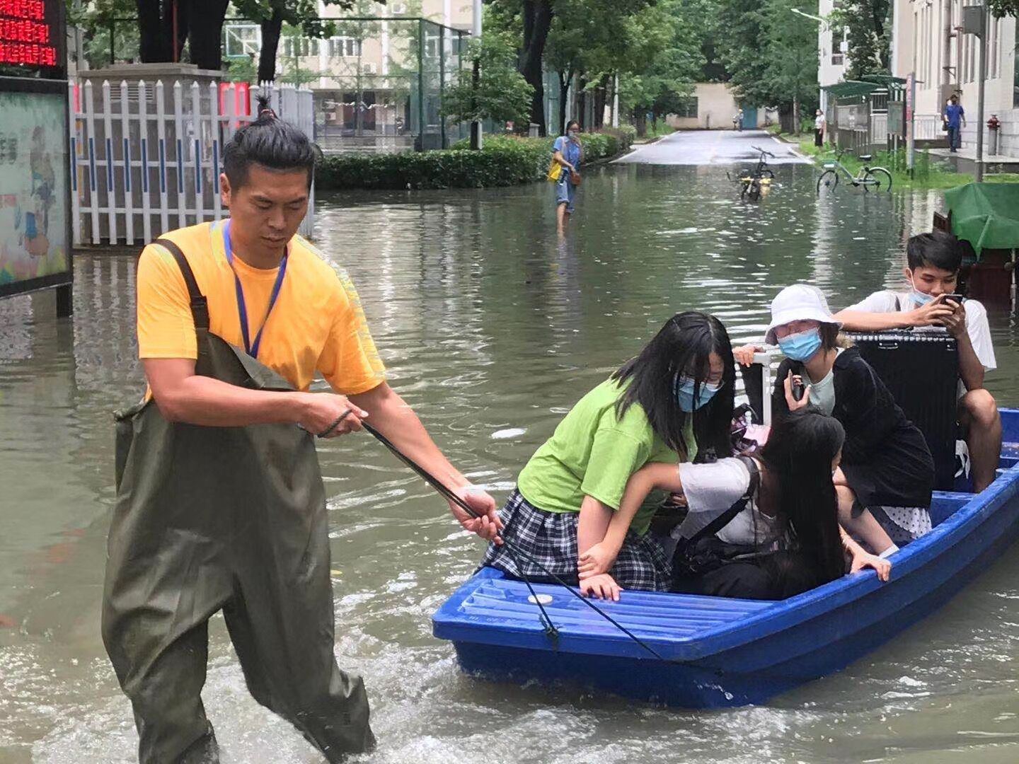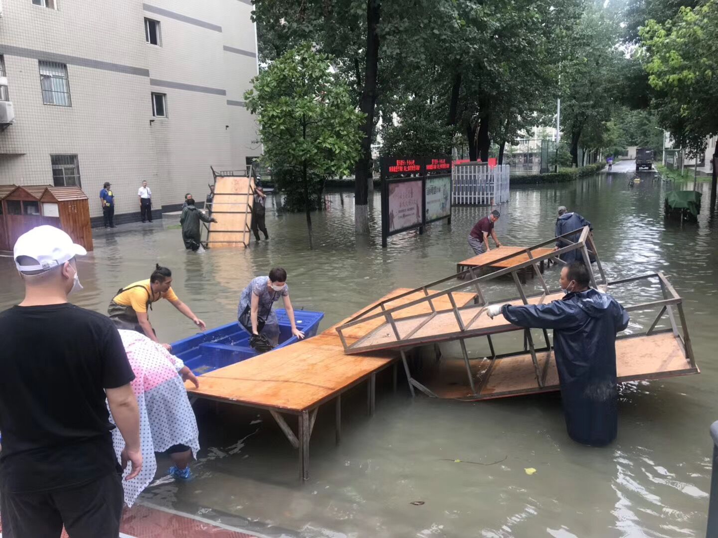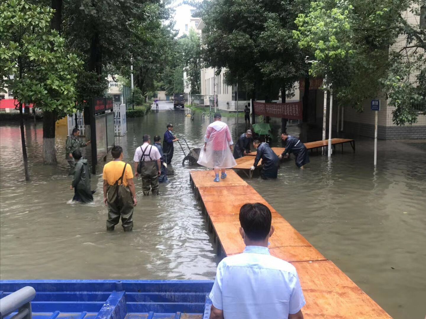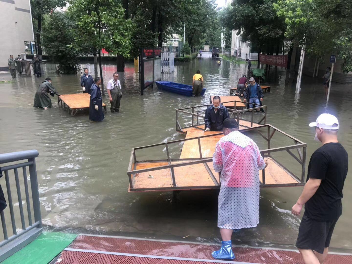 10点左右,持续的暴雨导致市政雨水管网排放能力严重不足,学校周边主干道出现渍水,校内某些区域雨水开始出现反流。后勤保障处马上启动应急抢险模式,地下车库上挡水板,调集备用水泵到重点楼栋进行抽排,打开仓库准备浮桥、小舟。10点半左右,北区学生公寓出现严重渍水,校园环境中心张海鸥、钱诚、刘宜鑫三位主任,现场指挥抢险队紧急搭建浮桥,放入小舟,在浮桥完全搭建完成之前,钱诚同志不畏艰难,涉水用小舟摆渡部分学生进出,毕业返校同学们开心地体验着小舟出行的乐趣。因疫情影响,北区学生饮食是由南区食堂转运保障的,在这恶劣天气下,饮食中心为了保障北区学生正常午餐,王立军、张娇两位主任,带着厨房师傅们,涉水将就餐物资转运到北区食堂,没有让学生们午餐受到任何影响。
