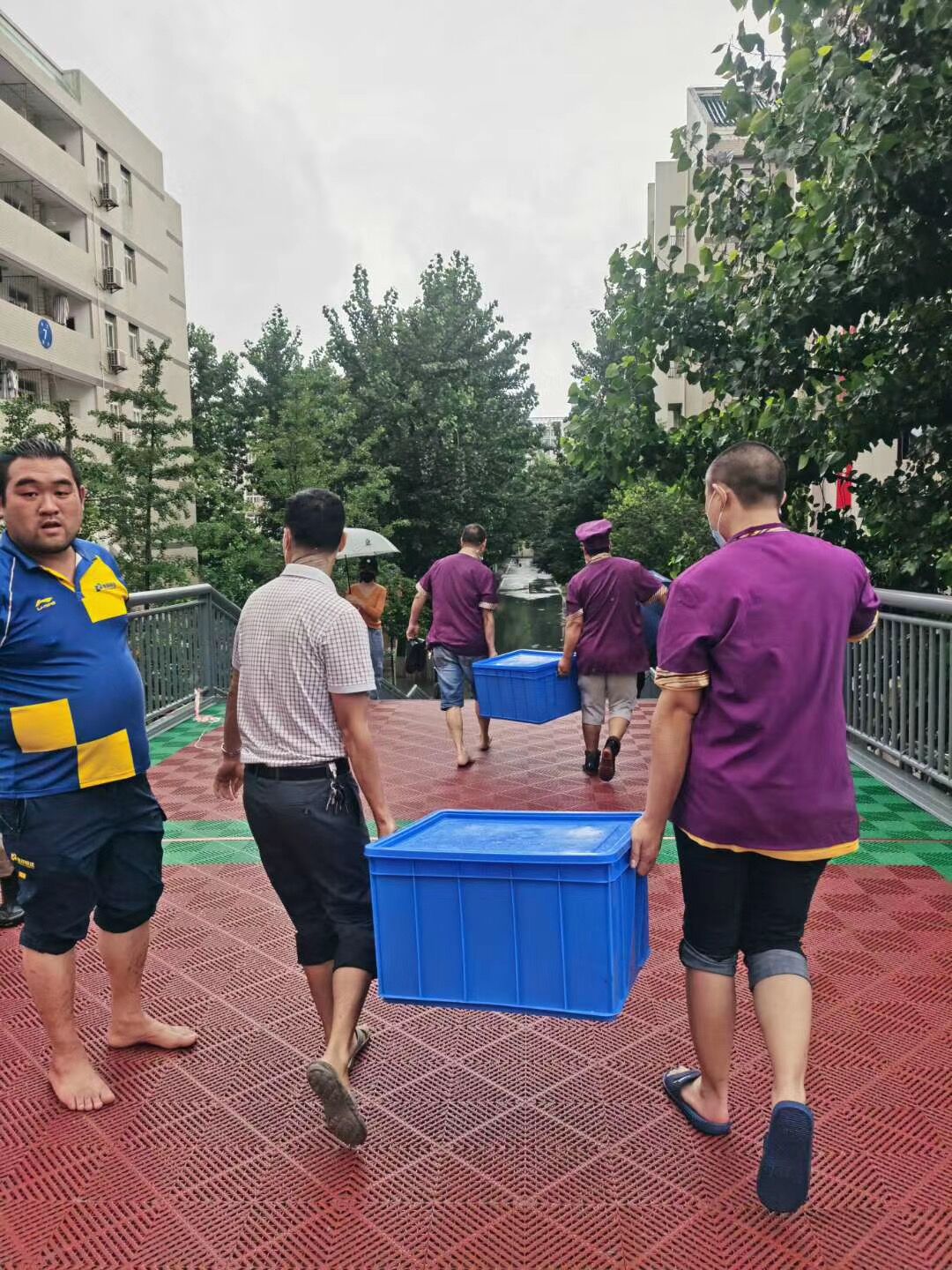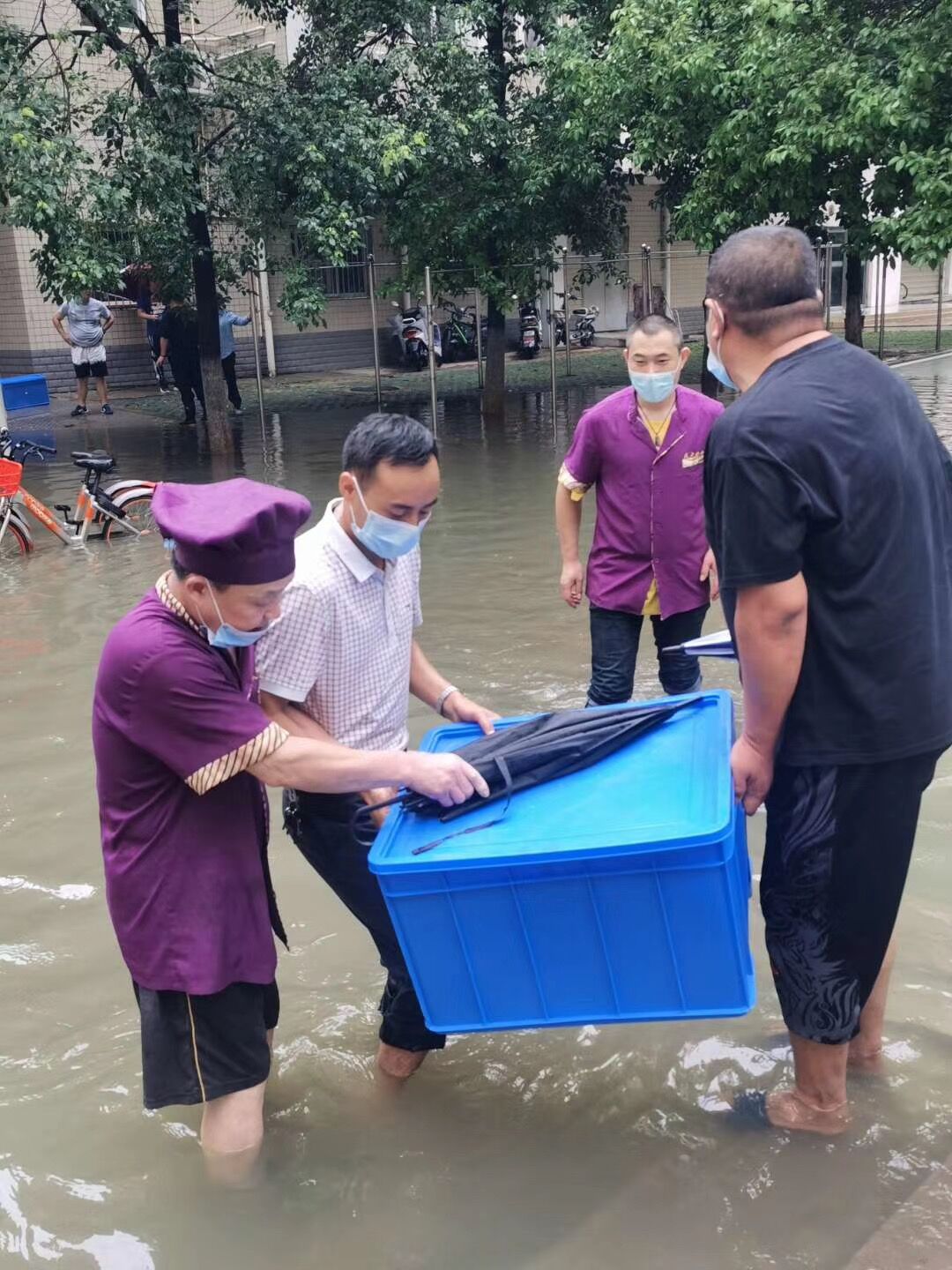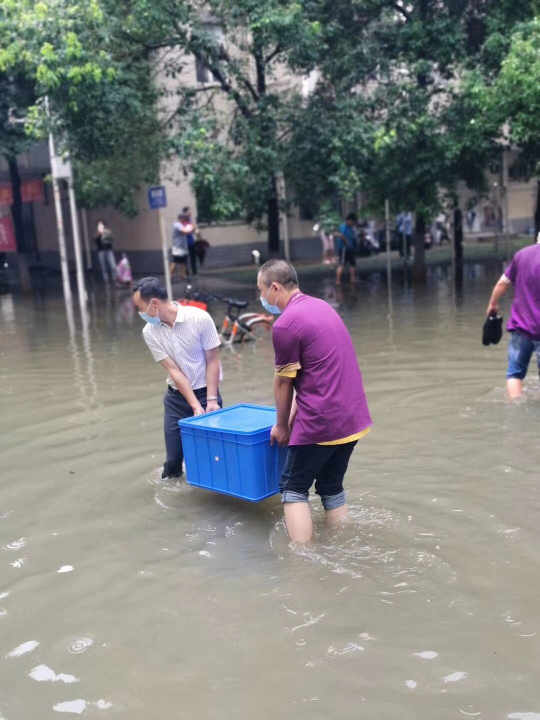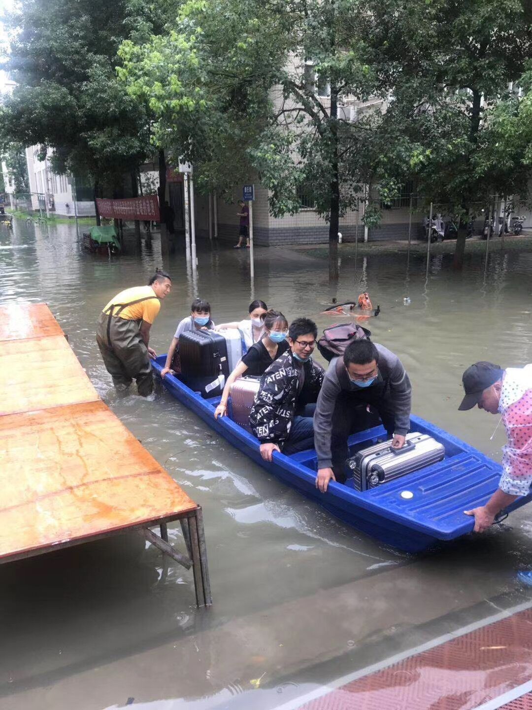 10点左右,持续的暴雨导致市政雨水管网排放能力严重不足,学校周边主干道出现渍水,校内某些区域雨水开始出现反流。后勤保障处马上启动应急抢险模式,地下车库上挡水板,调集备用水泵到重点楼栋进行抽排,打开仓库准备浮桥、小舟。10点半左右,北区学生公寓出现严重渍水,校园环境中心张海鸥、钱诚、刘宜鑫三位主任,现场指挥抢险队紧急搭建浮桥,放入小舟,在浮桥完全搭建完成之前,钱诚同志不畏艰难,涉水用小舟摆渡部分学生进出,毕业返校同学们开心地体验着小舟出行的乐趣。因疫情影响,北区学生饮食是由南区食堂转运保障的,在这恶劣天气下,饮食中心为了保障北区学生正常午餐,王立军、张娇两位主任,带着厨房师傅们,涉水将就餐物资转运到北区食堂,没有让学生们午餐受到任何影响。