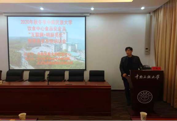 为全面做好秋季校园新冠疫情常态化防控期间食品安全工作,确保师生和教职员工的饮食安全和身体健康,严格落实《学校食品安全与营养健康管理规定》、《省市场局、教育厅、公安厅、卫健委关于湖北省校园食品安全守护行动实施方案》、《市市场监管局市教育局市卫健委关于武汉市2020年学校开学疫情防控与食品安全隐患排查实施方案》、《武汉市餐饮服务单位互联网+明厨亮灶工作指导意见》和各项防疫保障措施。切实做好校园安全保障工作,防范疫情防控、食品安全风险、加强食育教育、减少餐饮浪费。进一步加强校园疫情防控和食品安全知识培训、互联网+明厨亮灶智慧食安系统推进工作。12月11日在威尼斯886699接待中心会议室开展了校园食品安全及互联网+明厨亮灶智慧系统推进培训,各食堂经理及从业人员60余人参加了培训会。