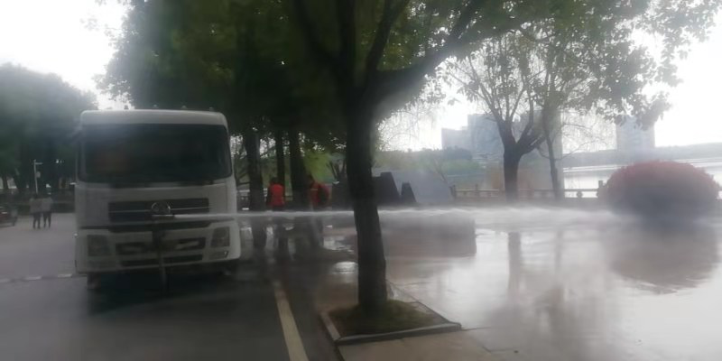 图为3月2日早上洒水车清洗校园路面