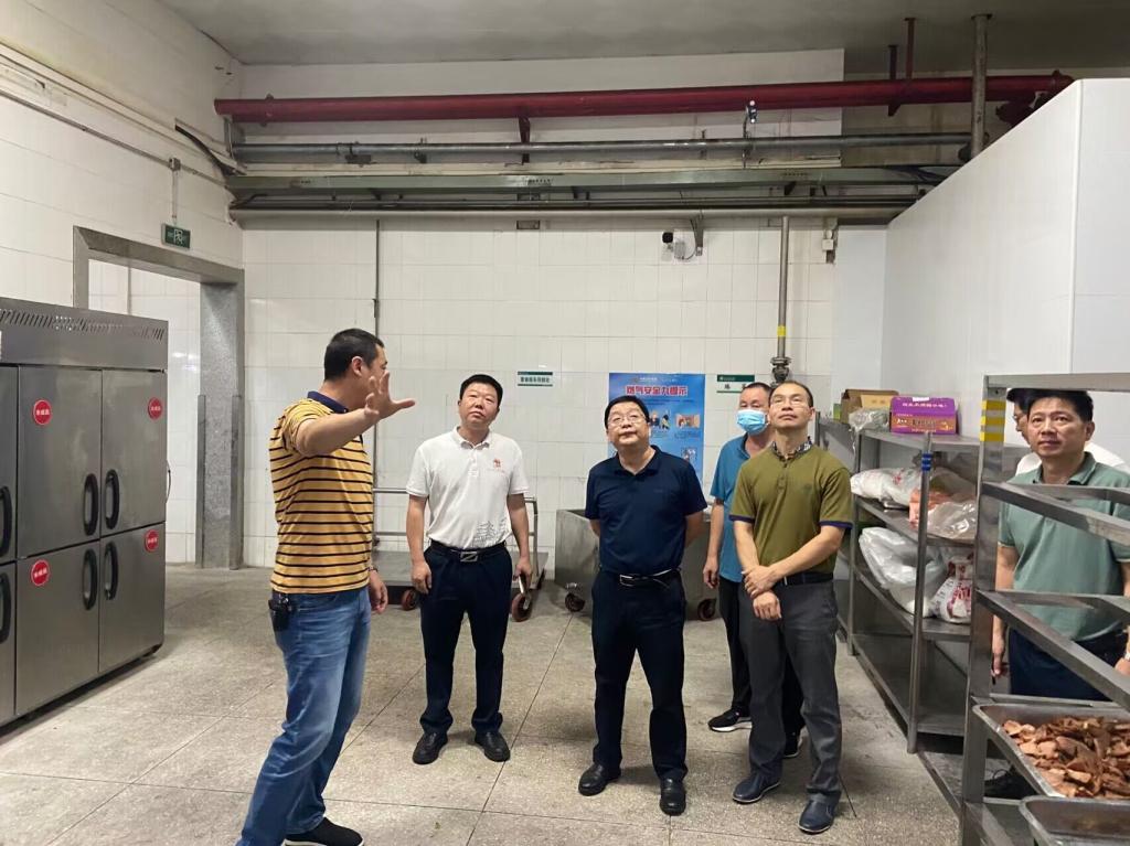 乔俊杰一行仔细检查食堂备餐区