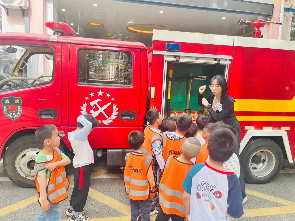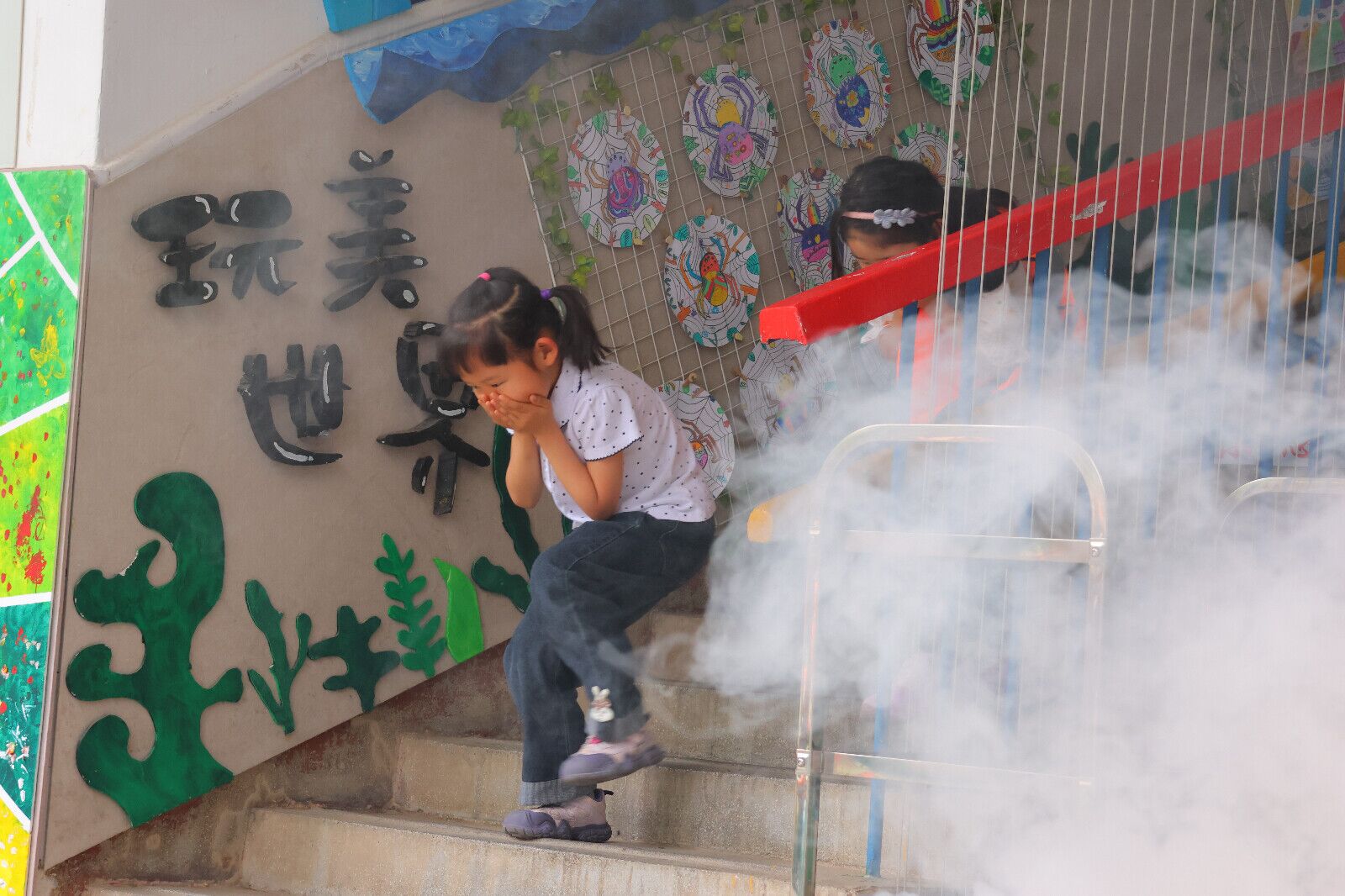 演练结束后,幼儿园分年龄段轮流开展了丰富多样的消防教育活动:近距离参观消防车,了解消防设备功能;通过“逃生帐篷”体验火场逃生;参与消防知识互动,学习灭火器、防烟面罩使用方法。