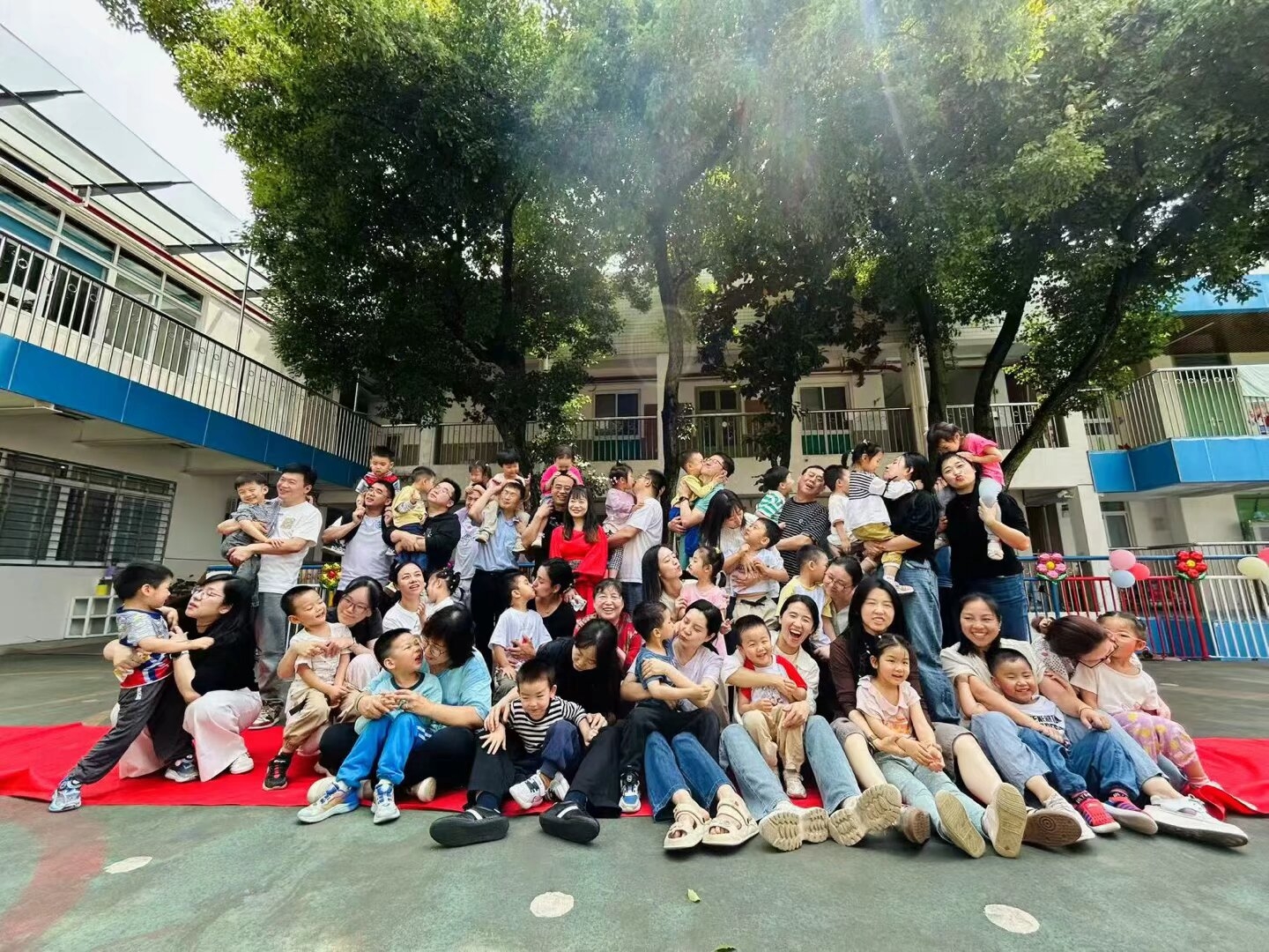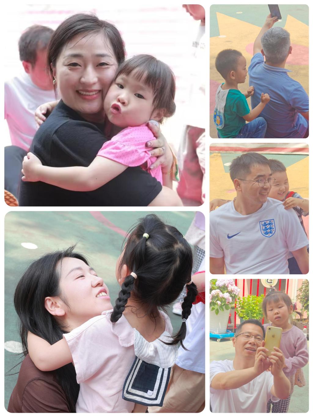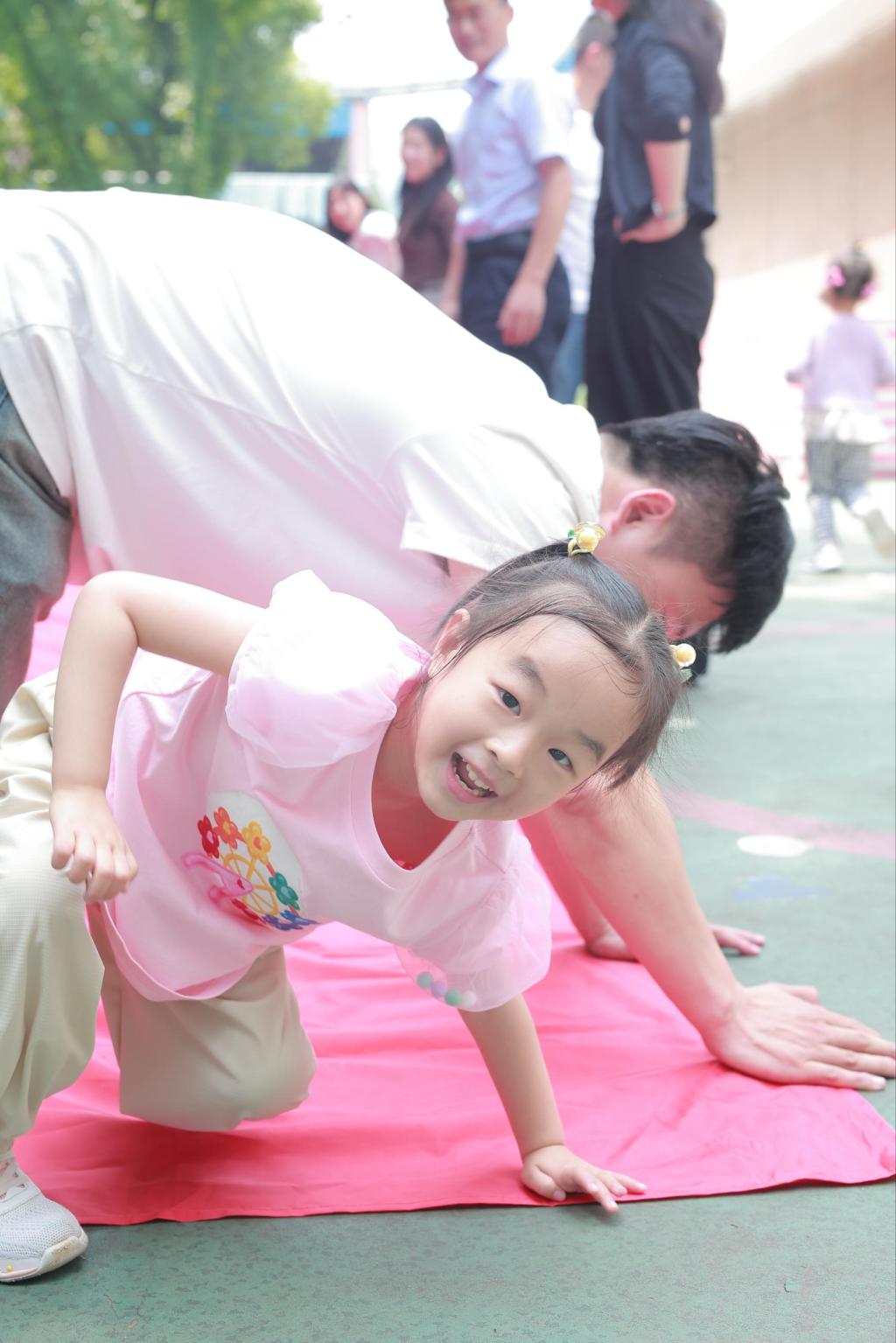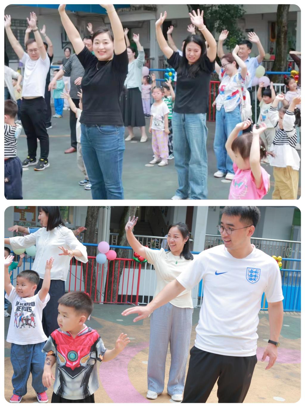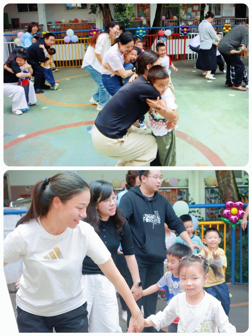 亲子律动《兜兜风》温情上演——家长与孩子手拉手转圈、拥抱,传递着浓浓爱意,仿佛乘着微风,将爱意洒满每个角落,操场化身为温馨的亲情海洋。