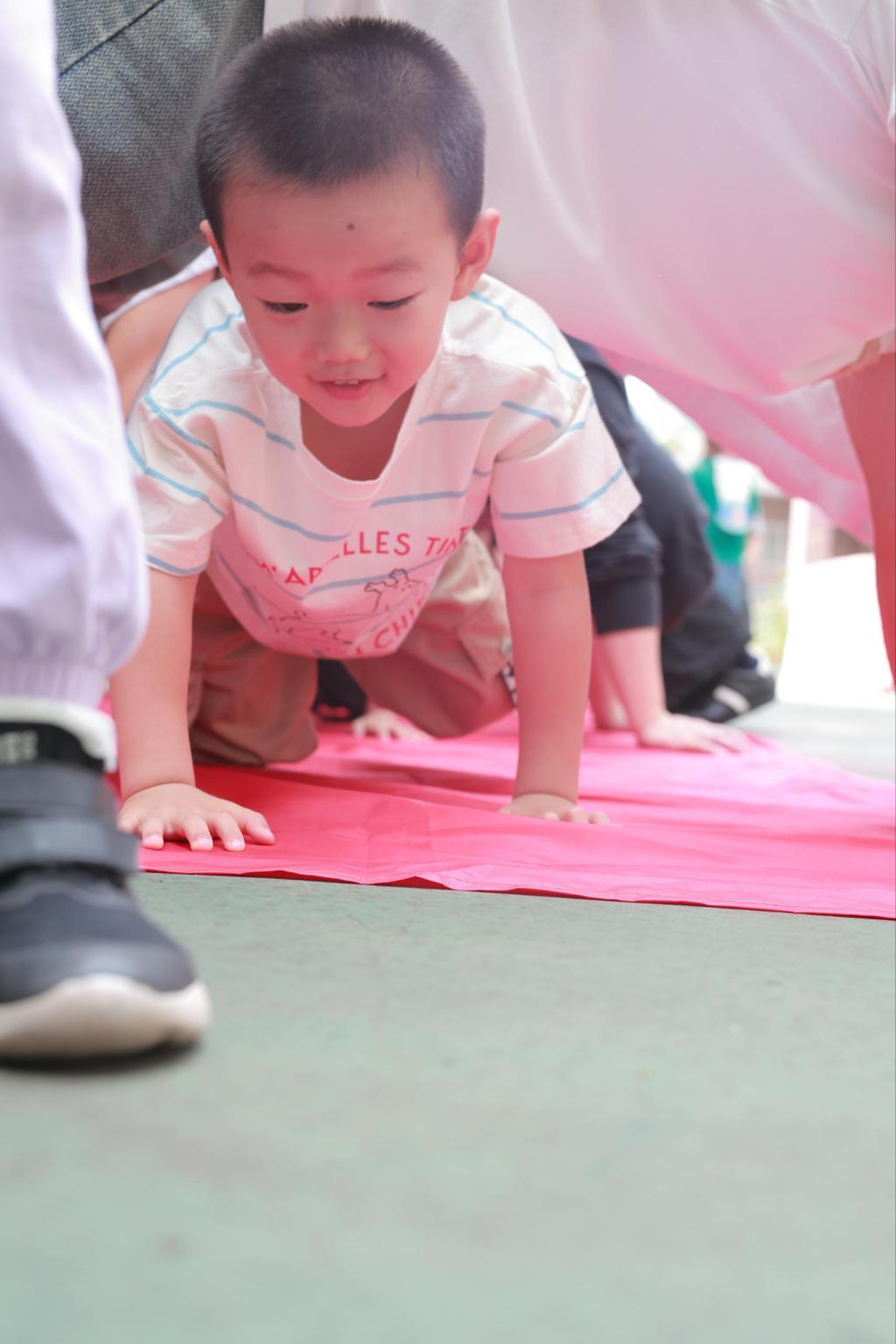3.“爱的山洞”穿越:爸爸妈妈手脚撑地化身“人形山洞”,孩子们咯咯笑着钻过,温暖又治愈~~~