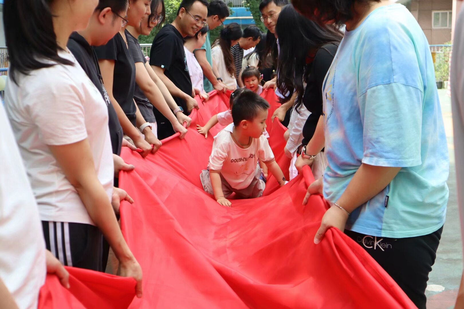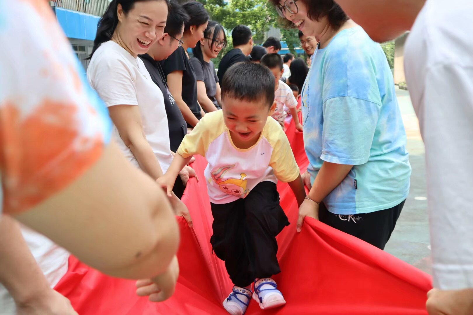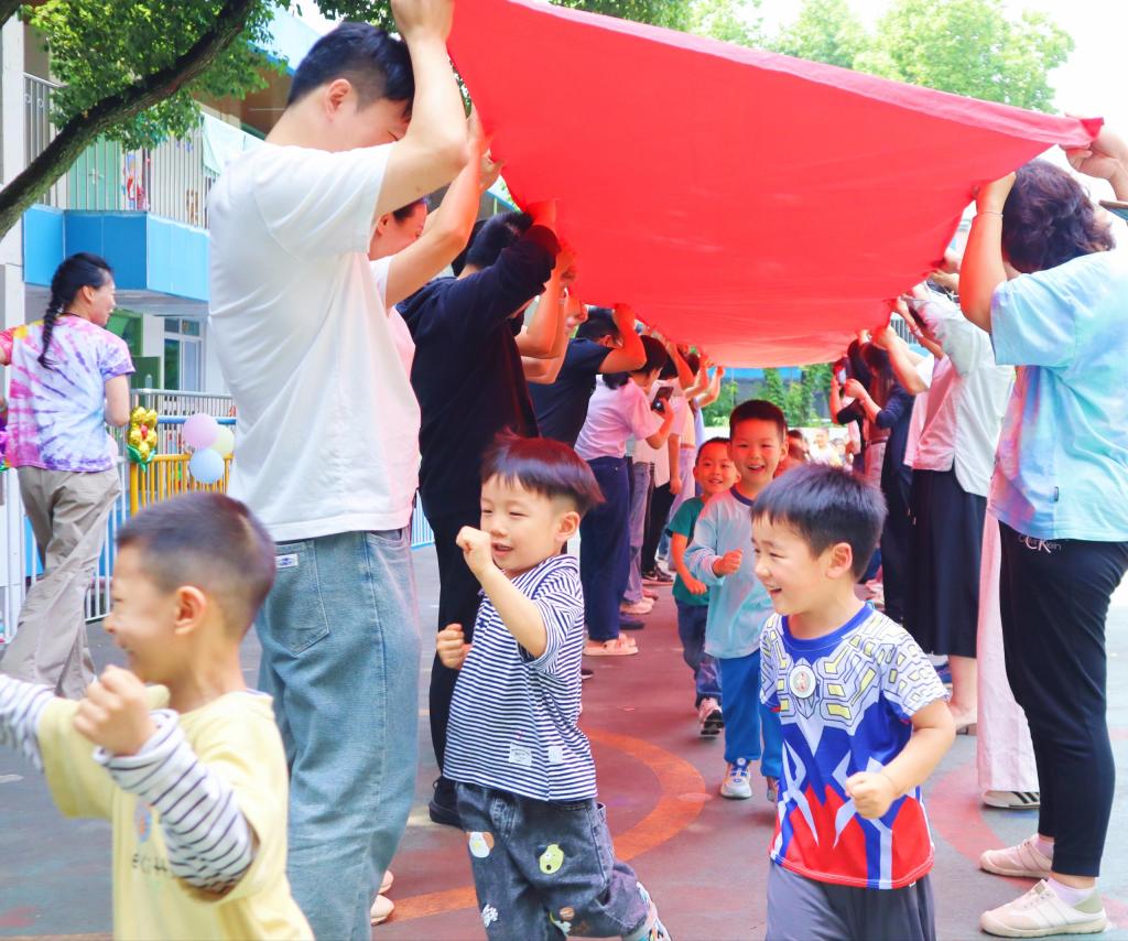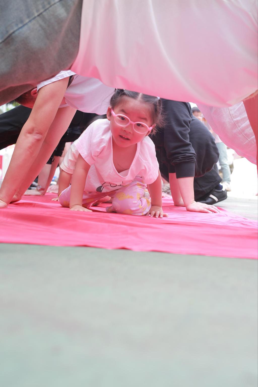 1.“红桥”奔跑赛:家长合力高举溜溜布成红桥,孩子们如小精灵般穿梭而过,欢呼声震天响!