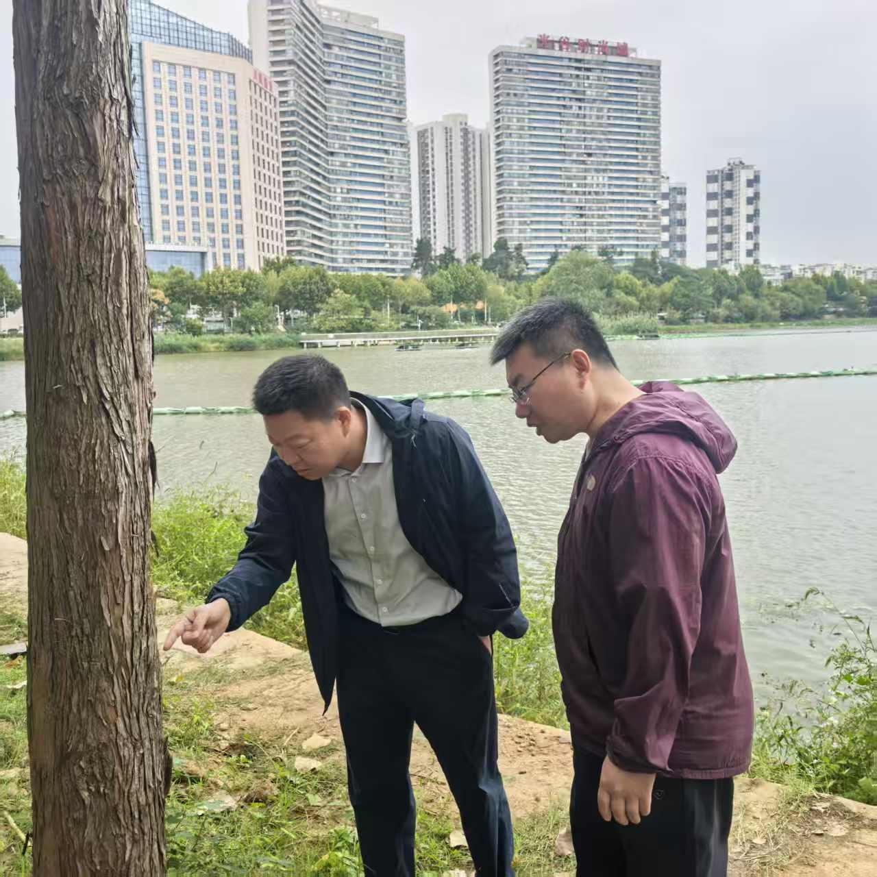 10月13日,在后勤保障处相关负责人与技术人员的全程陪同下,董立坤教授对问题树木开展全面现场勘查。依托深厚的专业积淀与丰富实践经验,他精准诊断出树木长势不佳的核心症结——根部环境异常,并同步提出“根部土球复壮+土壤杀菌”的关键改良方案,着重强调“根系养护是植物健康根本”的科学理念,为后续养护指明方向。