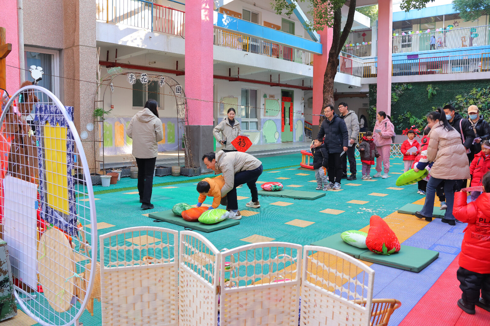 另一边的“五育集福”挑战区同样精彩纷呈。小二班门口的“爱的抱抱”游戏中,亲子用身体协作夹住气球往返穿梭,默契配合中增进了亲密感;二号操场的书写“福”字活动里,亲子携手握笔描红,在笔墨香中感受书法文化韵味,亲手书写的福字成为珍贵的新年纪念;三号操场的“福气宝宝向前冲”障碍赛上,亲子组队闯关梅花桩、攀爬体能垫,在奔跑跳跃中锻炼体能、收获勇气;“小马哒哒,新年哈哈”打卡地布置得年味十足,红灯笼与中国结相映成趣,集齐五福印章的家庭纷纷在此合影留念,定格温馨的亲子瞬间;“五谷丰登”游戏区,家长与孩子协作转移蔬菜抱枕,孩子们在抓取搬运中体会劳动乐趣,树立珍惜粮食的观念。“集福挑战”活动以五大游戏为载体,将五育理念融入各游戏环节,让亲子在趣味互动中全方位成长,推动“五育并举”理念落地生根。