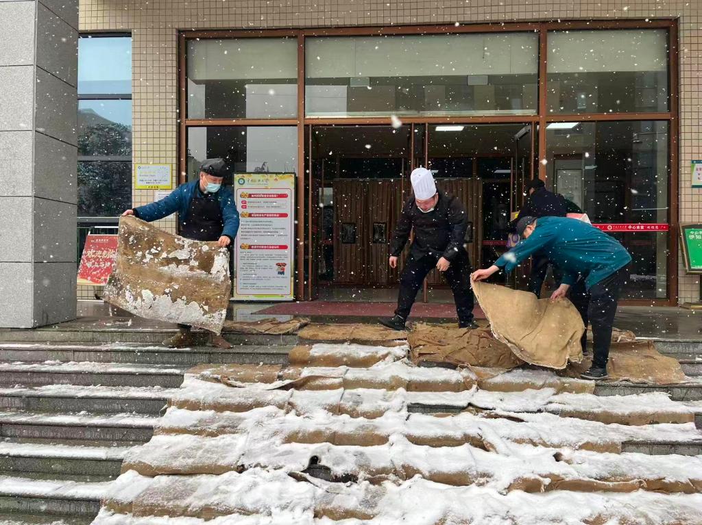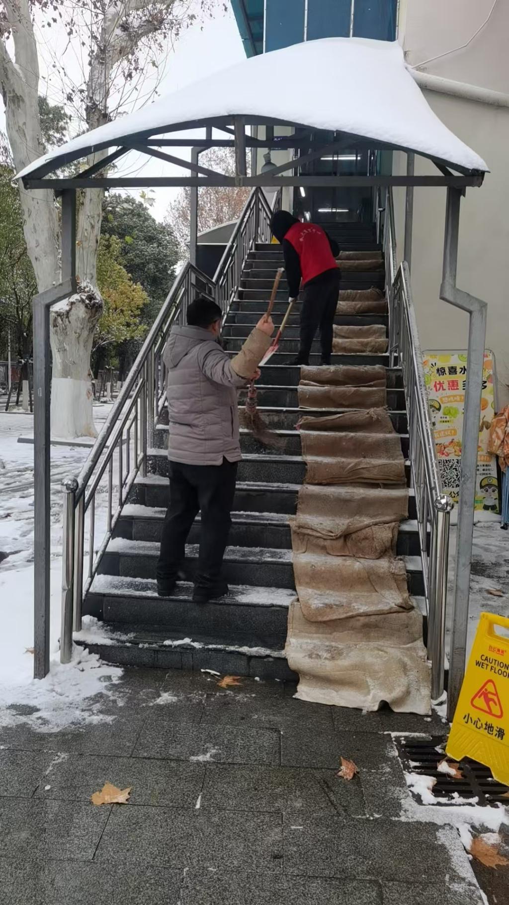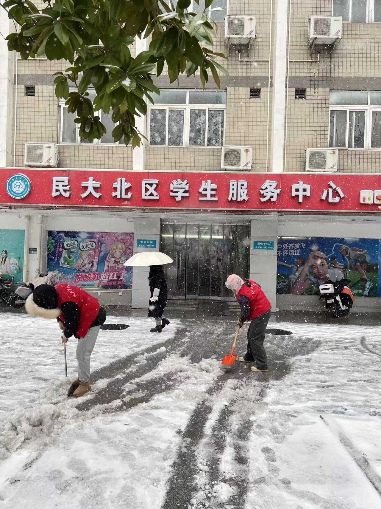 商贸服务中心、场馆服务中心、接待服务中心同步行动,全员集结投入除雪战斗。商贸中心员工早早到岗,分工协作、热火朝天,手持清扫工具对商户及顾客通行的主要入口、通道进行积雪清理,迅速开辟出安全通畅的道路;场馆服务中心对各场馆开展安全巡查,积极召集人员对各场馆门前通路进行铲雪防滑工作,确保师生、住客安全出行;接待服务中心聚焦师生用餐、住宿核心区域,对周边道路全面开展扫雪除冰作业,用忙碌的身影为寒冷清晨注入融融暖意,保障师生日常出行不受影响。