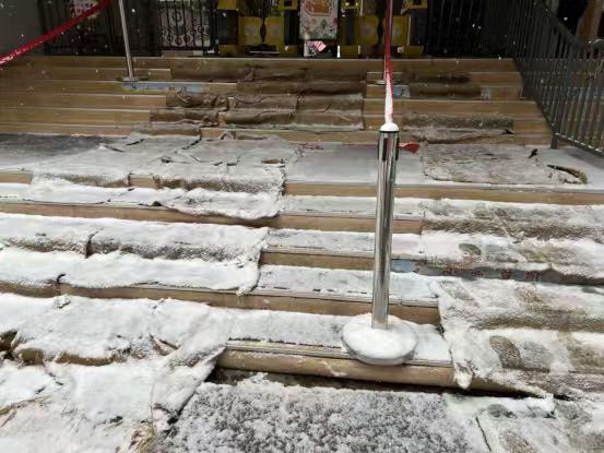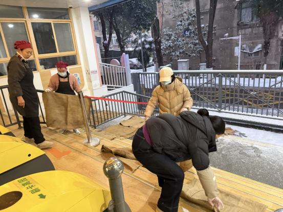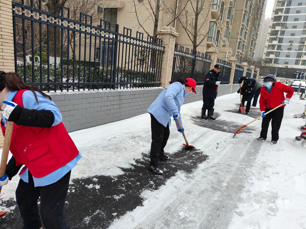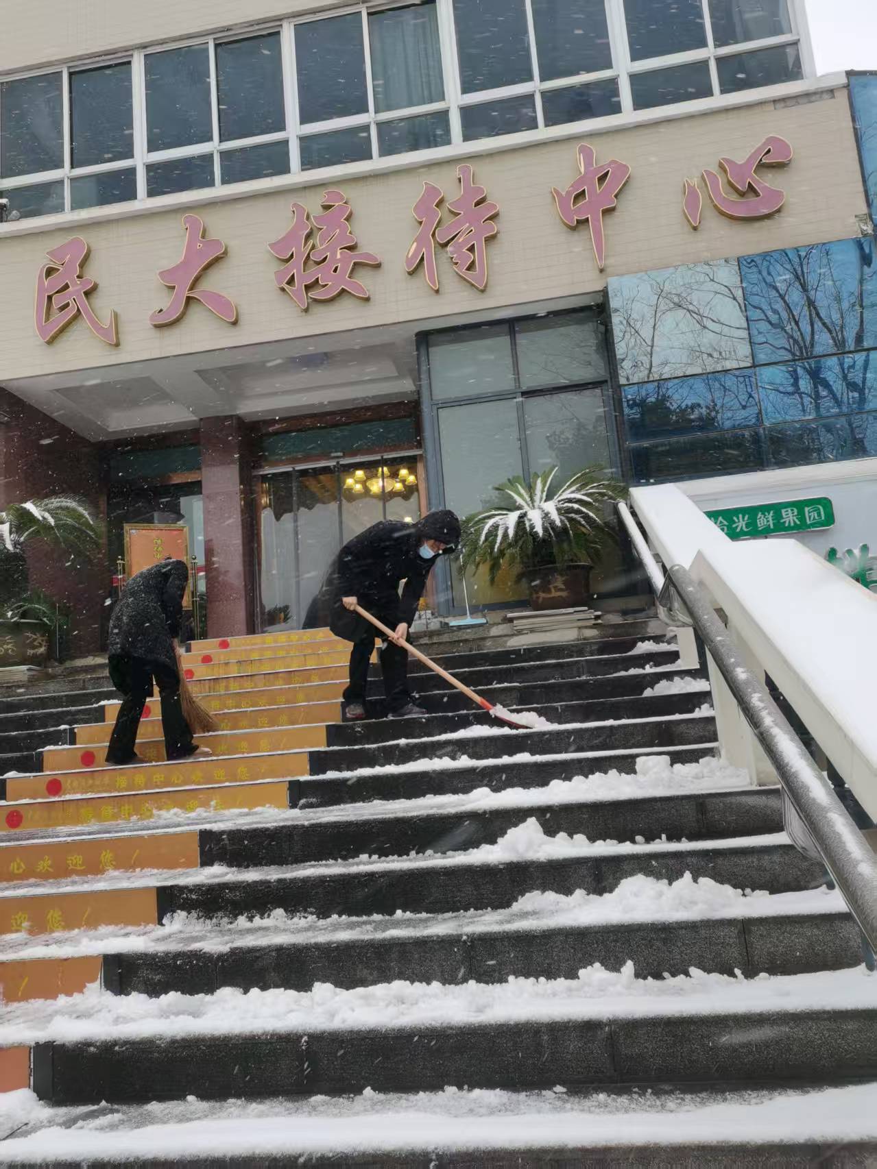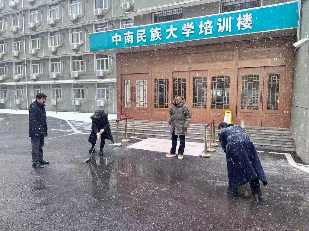 商贸服务中心、场馆服务中心、接待服务中心同步行动,全员集结投入除雪战斗。商贸中心员工早早到岗,分工协作、热火朝天,手持清扫工具对商户及顾客通行的主要入口、通道进行积雪清理,迅速开辟出安全通畅的道路;场馆服务中心对各场馆开展安全巡查,积极召集人员对各场馆门前通路进行铲雪防滑工作,确保师生、住客安全出行;接待服务中心聚焦师生用餐、住宿核心区域,对周边道路全面开展扫雪除冰作业,用忙碌的身影为寒冷清晨注入融融暖意,保障师生日常出行不受影响。