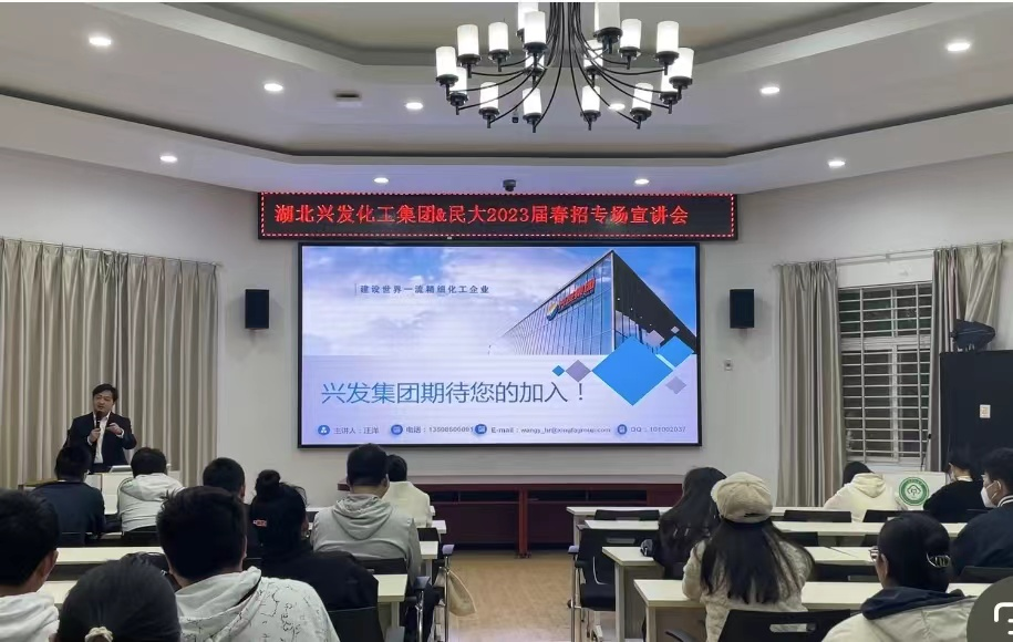 此次招聘会经校友联络开展。招聘会上,汪洋先生结合PPT向同学们介绍了湖北兴发化工集团股份有限公司的基本情况,兴发集团是国有企业,也是全国最大的精细磷化工企业和三峡库区最大的移民迁建企业,公司位居中国企业前500强。目前兴发集团有1家上市公司和多家子公司、参股联营公司,公司在内蒙古、江苏、重庆多地建立了规模化生产基地,兴发集团与宝洁、联合利华等公司均有合作。公司开发食品级、医药级、电子级各类产品,形成了“资源能源为基础、精细化工为主导、关联产业相配套”的良好发展格局。