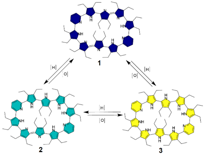 自然界的多数元素都具有不同的氧化状态,它们的氧化态与其化学性质、物理性质、及在生物体内的生理活性息息相关。具有较大共轭体系的有机大环化合物也可以存在不同的氧化态,然而,尽管这类化合物在分子识别方面有着天然优势,具有多重闭壳氧化态的大环化合物仍非常罕见。为了开拓大环化合物在分子识别中的应用,张展教授课题组设计合成了一个具有三重闭壳氧化态的扩展卟啉化合物——环[2]吡啶[8]吡咯。该大环化合物可以以三种氧化态存在,遇到硫醇会被还原呈现出不同颜色,从而可以区分识别具有生理活性的生物硫醇,即半胱氨酸、同型半胱氨酸、及谷胱甘肽。