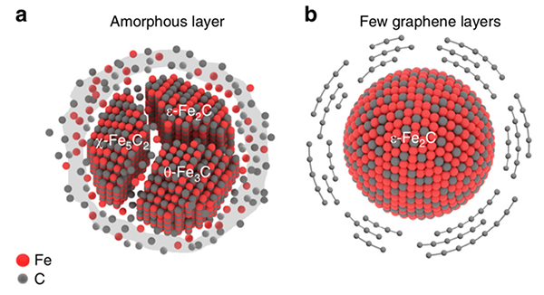 该团队于2014年就开展了铁基费-托合成催化剂的活性相调控的研究工作。经过多年的努力,他们成功设计合成了一种石墨烯层包裹限域的ε-Fe2C纳米材料,这种纳米材料在工业费-托合成条件下具有优异的活性和稳定性,是迄今为止文献报道的活性最高的铁基费-托合成催化剂。进一步的研究表明,这种纳米材料中的ε-Fe2C物相在高温下能保持稳定存在,实验和量子化学理论计算研究证明石墨烯包裹层有助于抑制ε-Fe2C在高温下的相变和积碳。