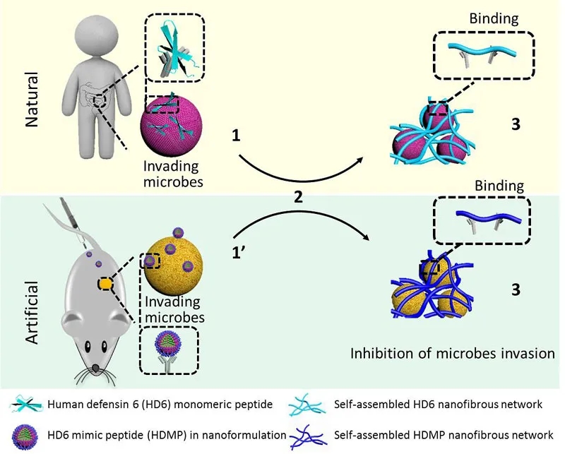 近年来,抗生素的使用导致菌群失调和耐药菌的出现。抗生素不具备选择性,在杀死病原菌的同时,也将肠道内的有益菌一同杀死了,导致所谓的菌群失调现象:从过去的有益菌占优势的状态,变为有害菌占优势的状态,从而引发各种疾病。另一方面,重复使用一种抗生素会使致病菌产生抗药性,即我们在使用抗生素治疗疾病的同时,也使细菌的耐药能力增强,最终对这种抗生素不再敏感。如今的“超级细菌”就是滥用抗生素的结果。我国细菌对抗菌药物的耐药形势仍较严重,尤其是碳青霉烯类耐药革兰阴性杆菌、革兰氏阳性耐甲氧西林金黄色葡萄球菌(MRSA)。现在亟需新型精准抗菌策略来解决这一尴尬局面。科学家试图从人类免疫系统中寻找到新的抗菌机制并从中找到灵感。防御素是在生物免疫系统中起到重要调节作用的多肽分子,并且大多数防御素具有直接杀菌功能,是重要的抗菌肽。人防御素-6(HD-6)在小肠分泌性潘氏细胞高表达并且通过自组装形成纤维网络,铆钉细菌阻止其入侵宿主细胞来进行抗菌。HD-6这种捕获抗菌机制的发现提供了一种仿生模型,可以作为一种新的抗菌策略。本研究利用多肽纳米技术在体内实现了HD-6抗菌过程的仿生。设计并合成了一条HD-6模拟肽(HD6 mimic peptide, HDMP),纳米颗粒形态的HDMP可以靶向体内金黄色葡萄球菌表面,形变组装成纳米纤维捕获细菌,阻止细菌入侵宿主细胞,防治感染,取得较好的抗菌效果。